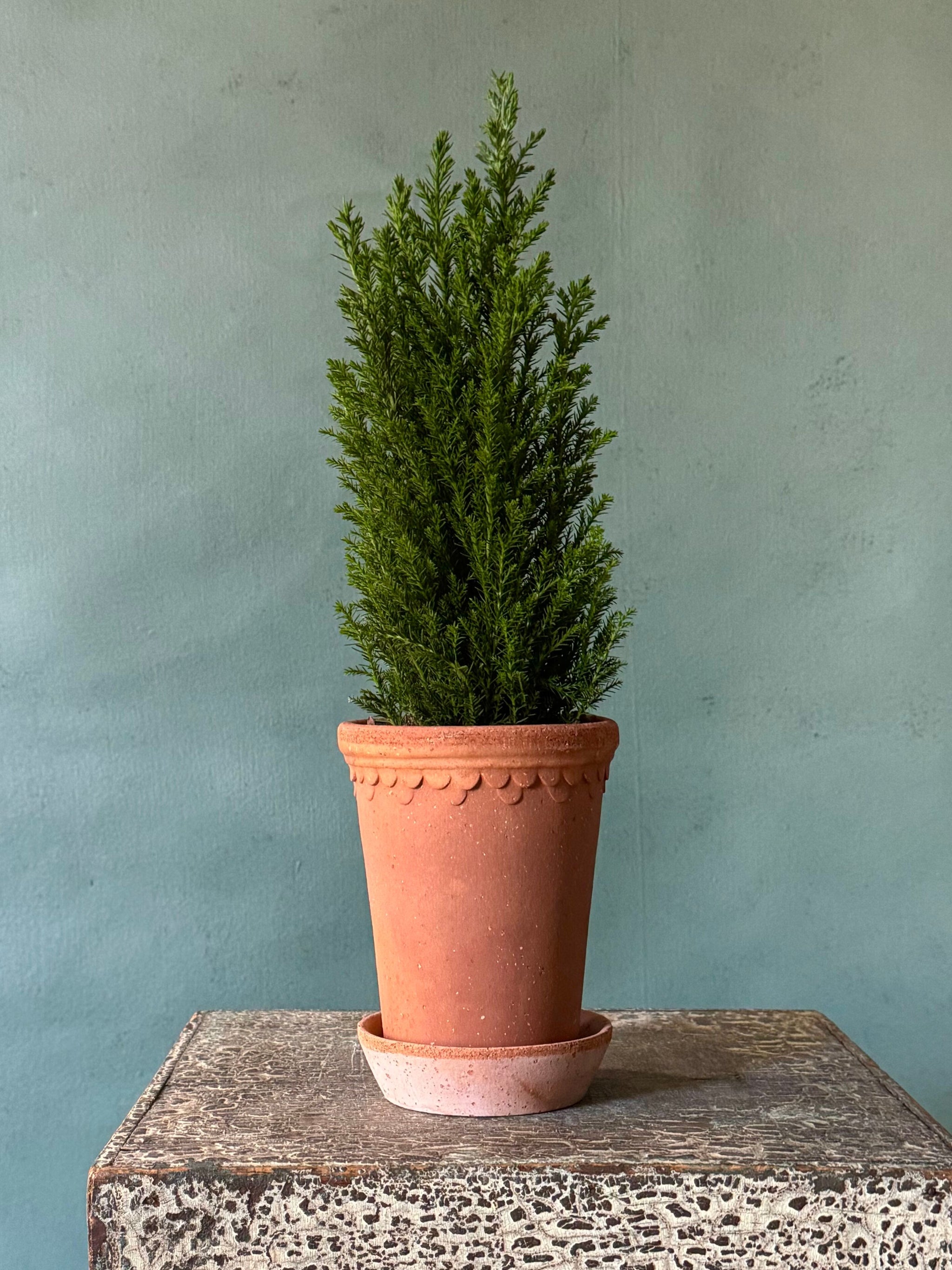 A graceful cypress tree, elegantly potted in the Bergs Castle terracotta pot. The textured, architectural design of the pot complements the tree’s slender, conical form, creating a striking and sculptural accent for any tabletop, shelf, or windowsill. Perfect as a seasonal centerpiece or a timeless addition to your home décor.
