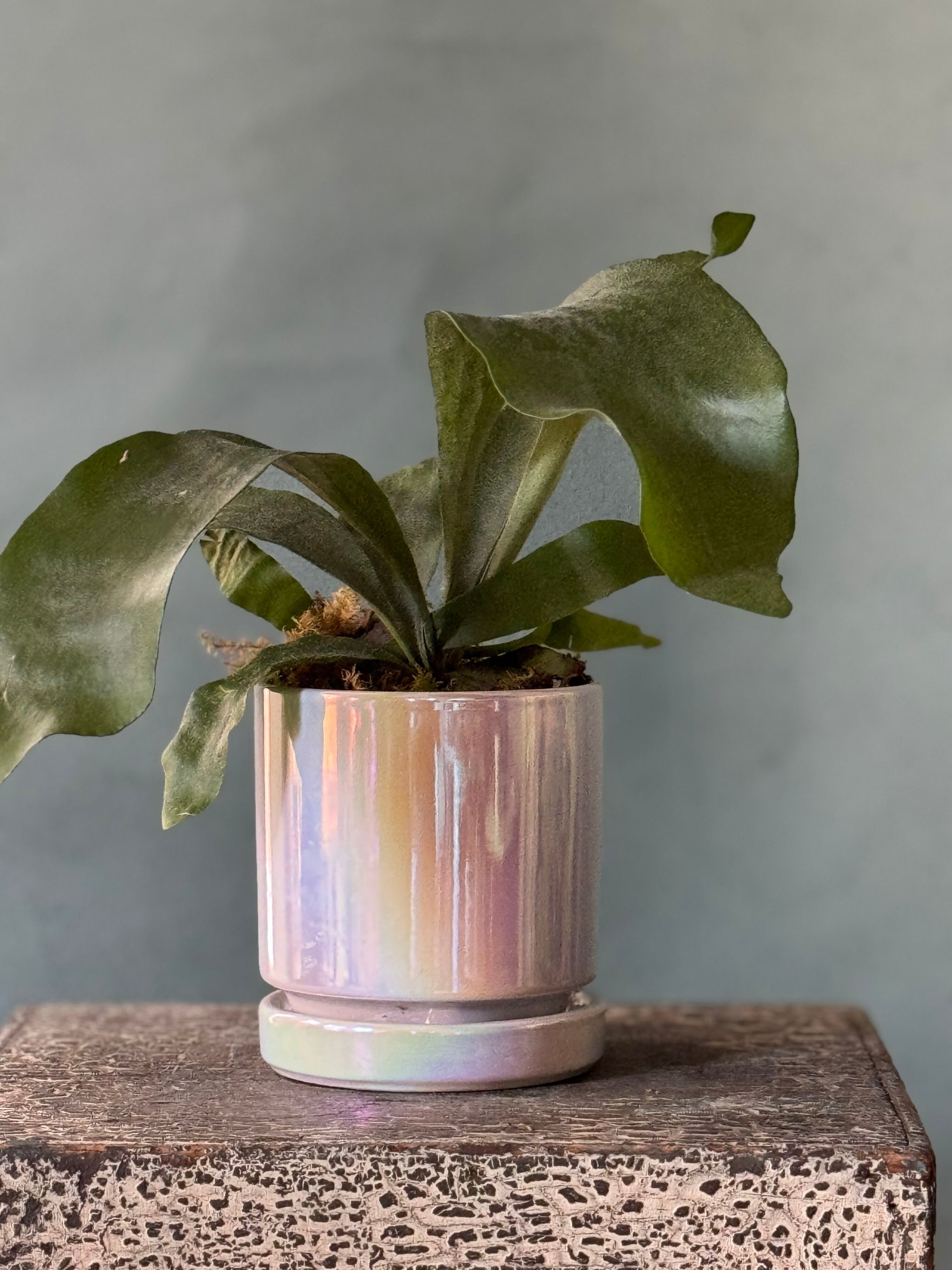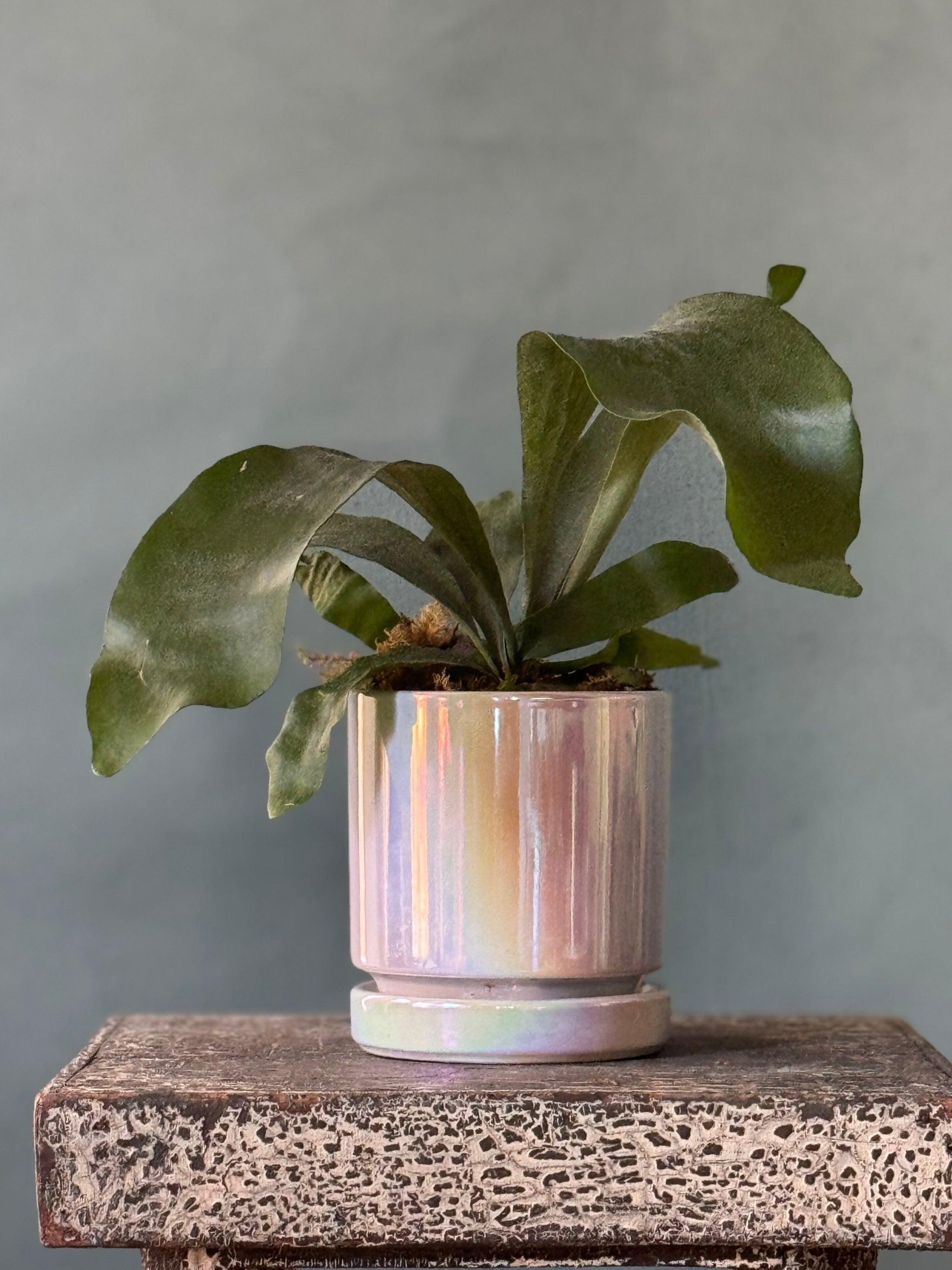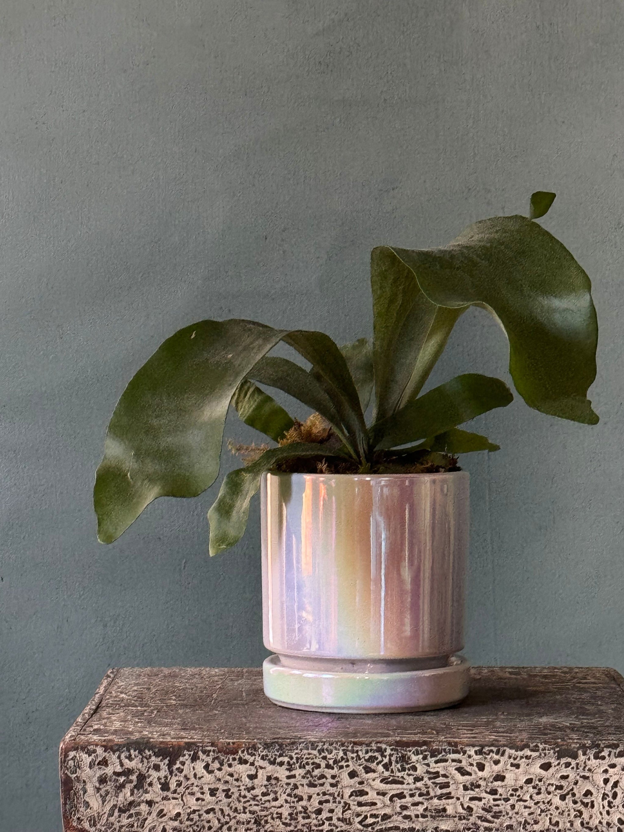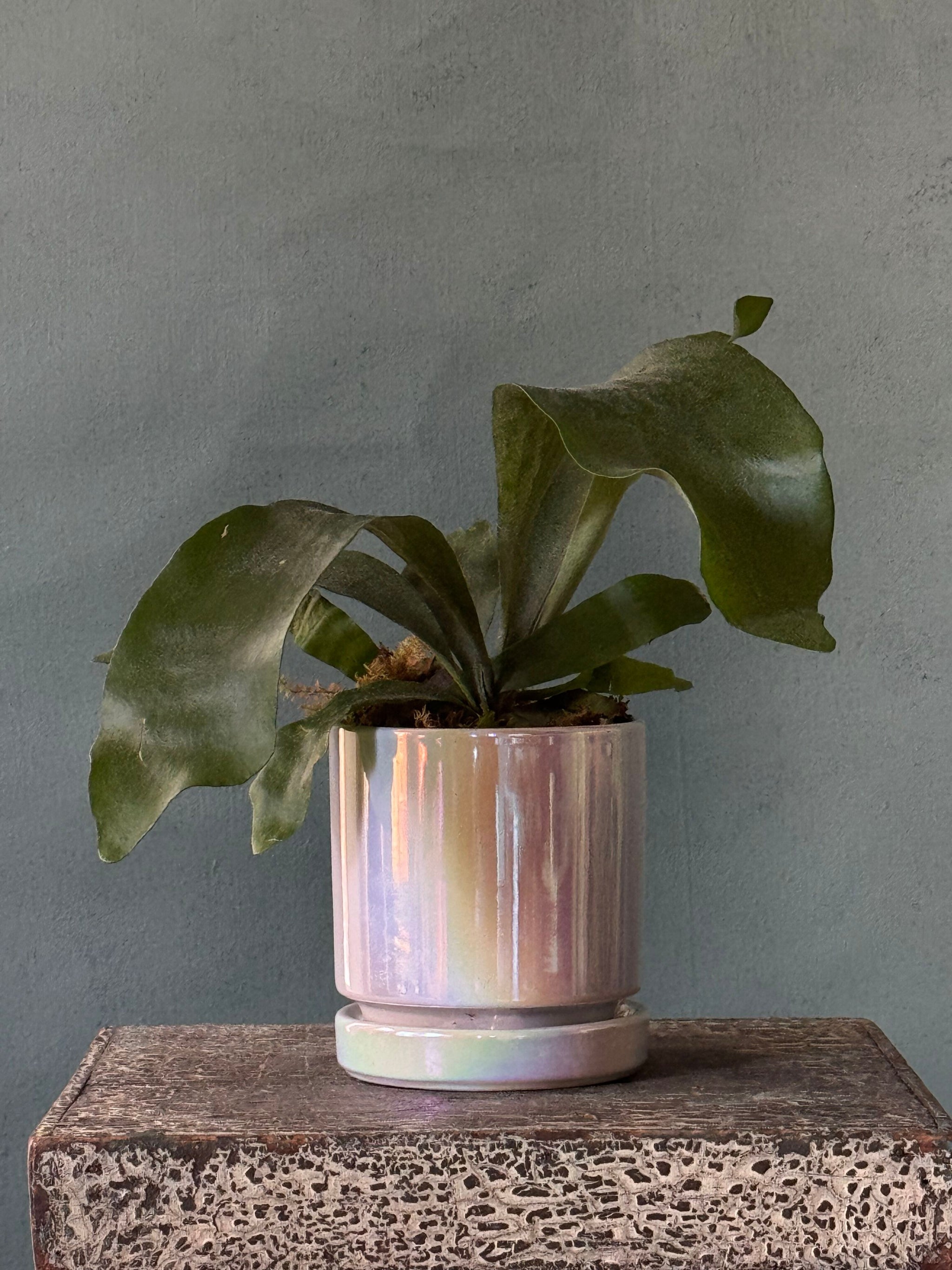 A sculptural staghorn fern potted in a mother-of-pearl ceramic pot with a matching saucer. Its iridescent finish adds a soft, elegant glow, highlighting the plant’s bold, architectural fronds. A striking accent piece that elevates any shelf, table, or windowsill.