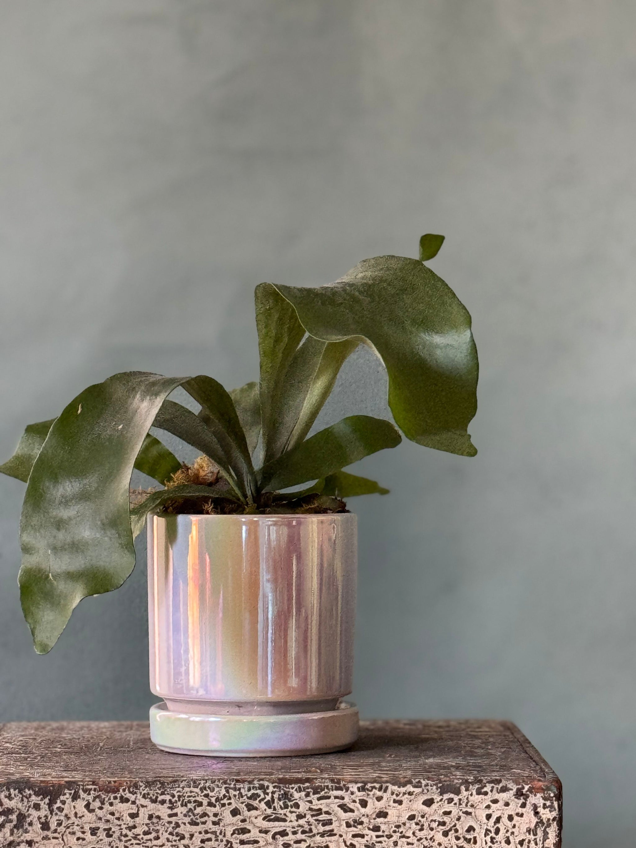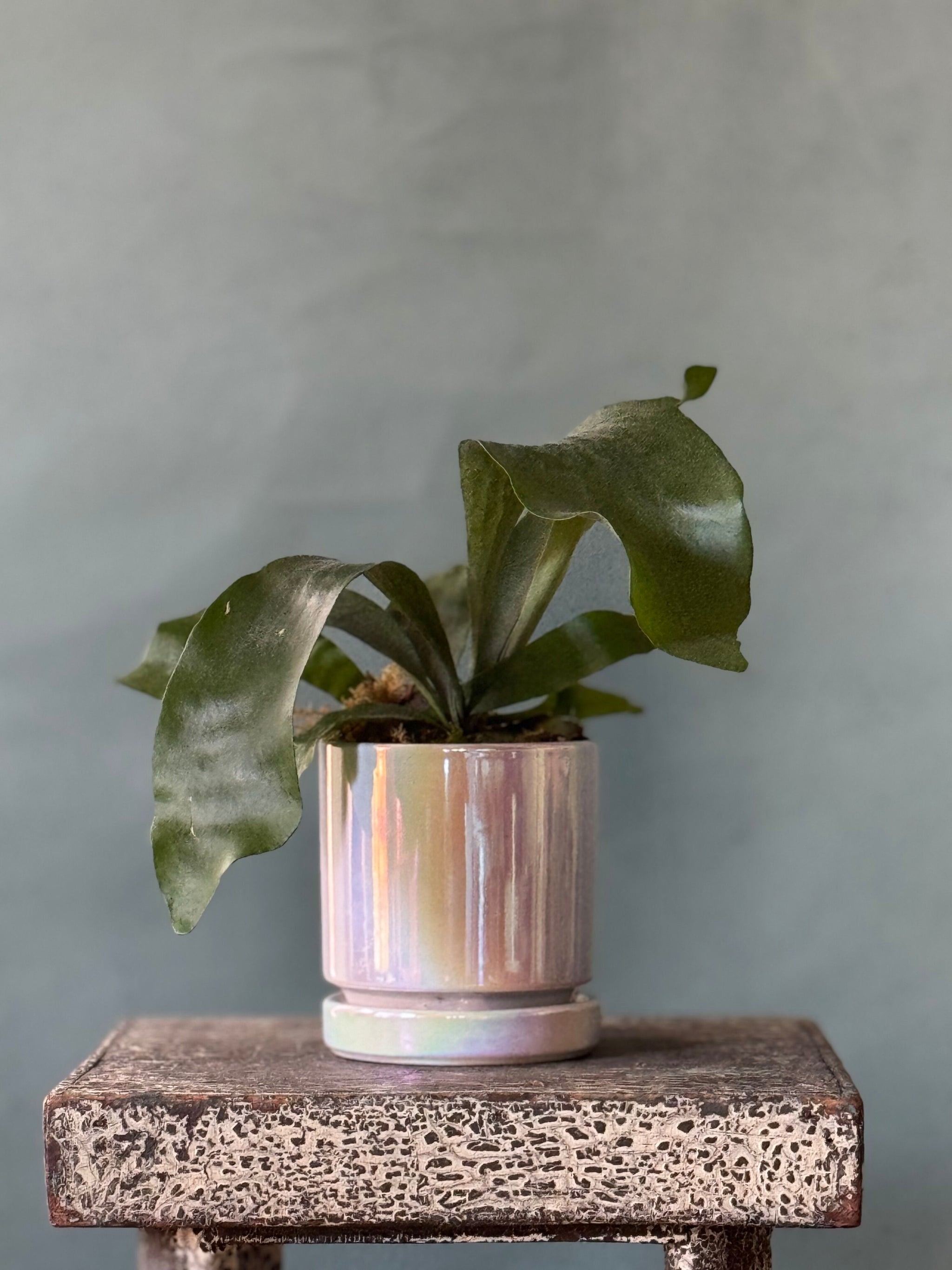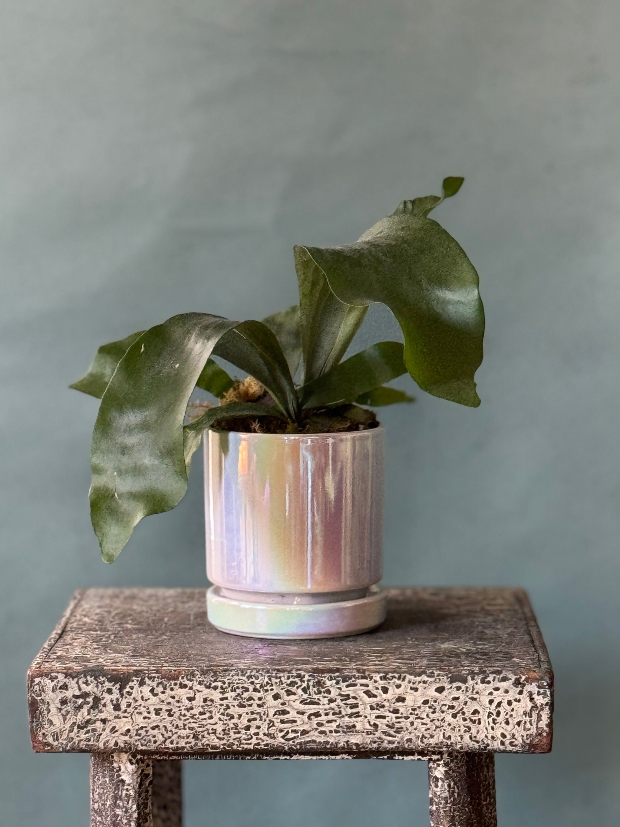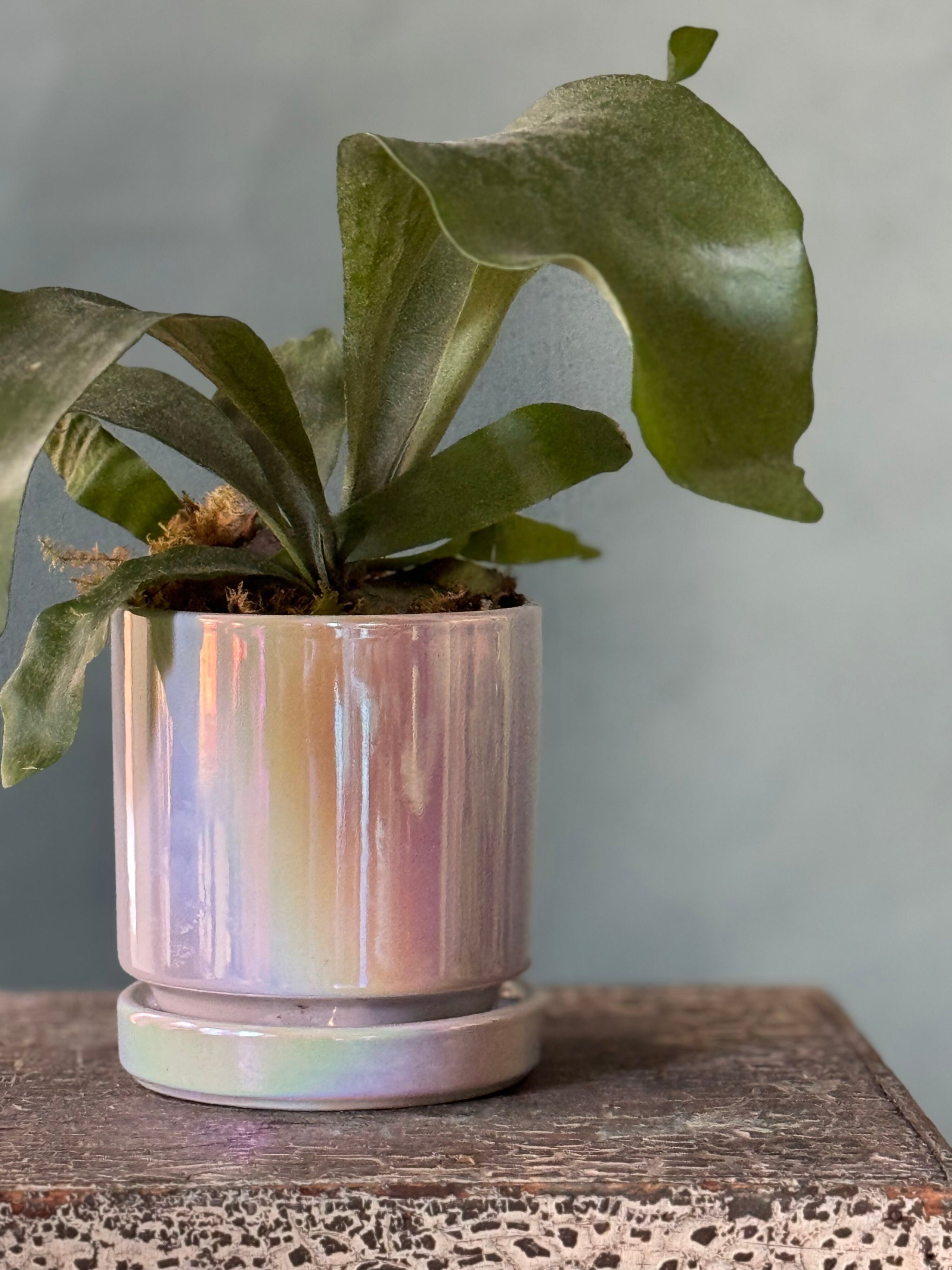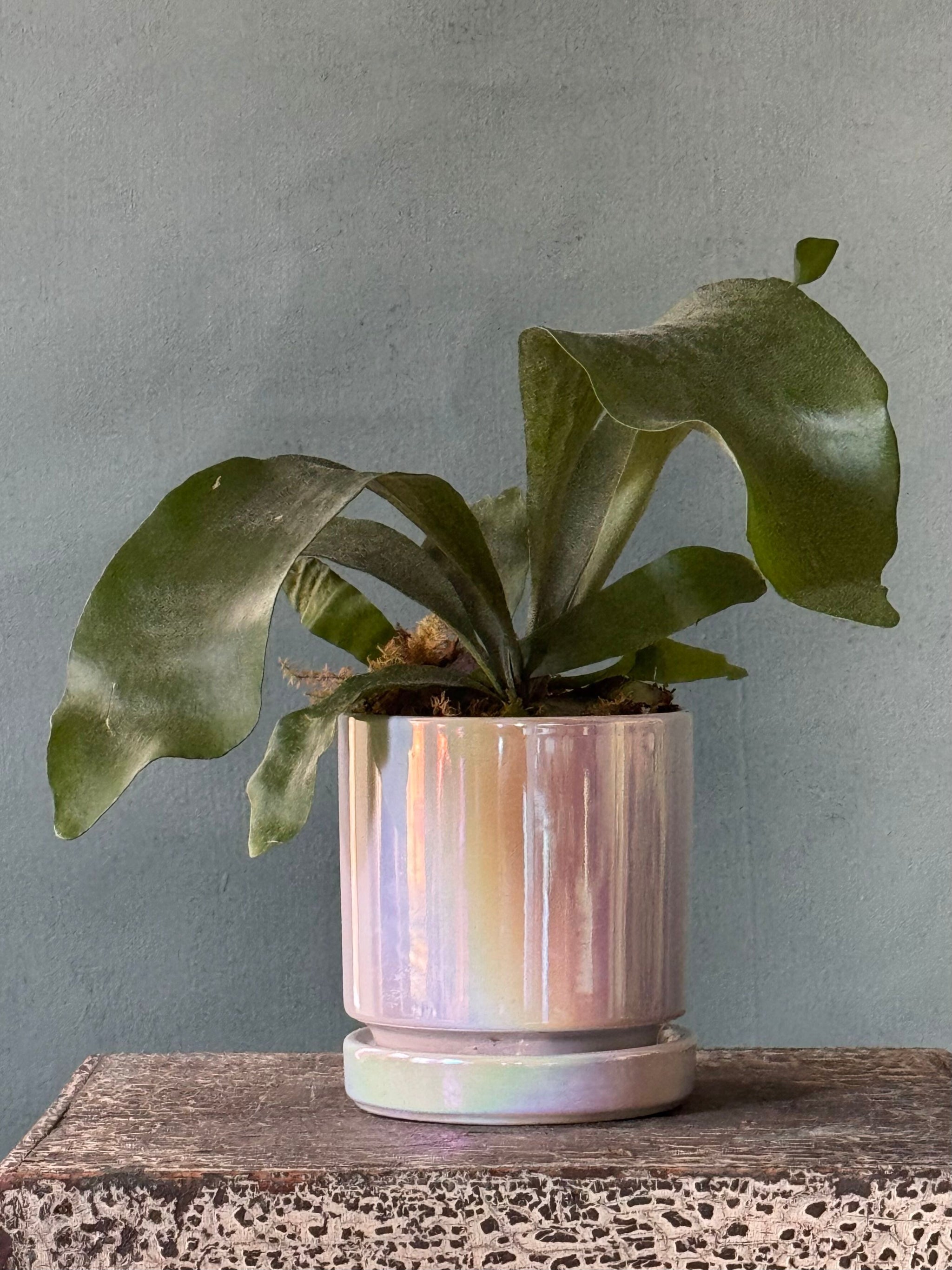 A sculptural staghorn fern potted in a mother-of-pearl ceramic pot with a matching saucer. Its iridescent finish adds a soft, elegant glow, highlighting the plant’s bold, architectural fronds. A striking accent piece that elevates any shelf, table, or windowsill.