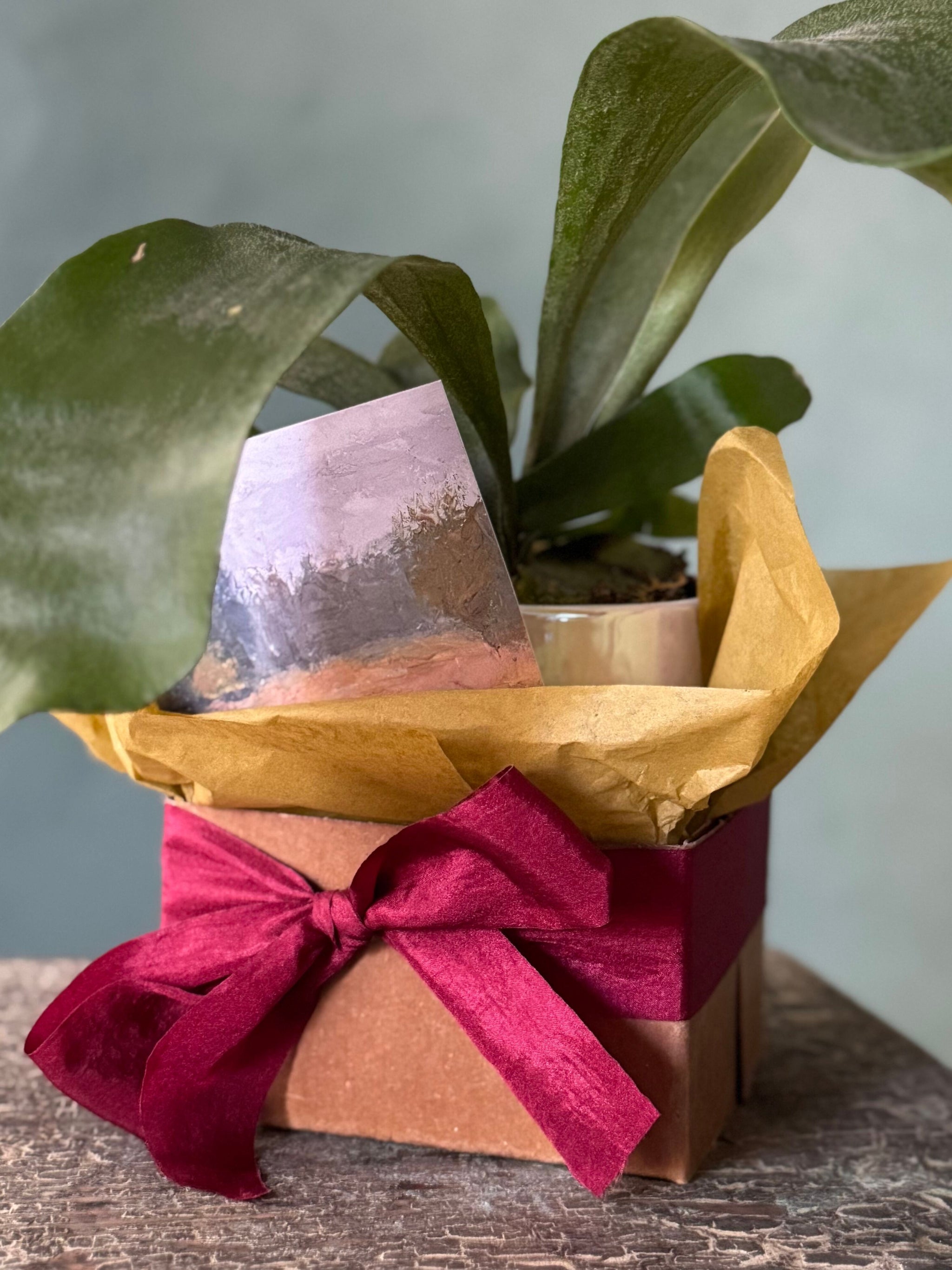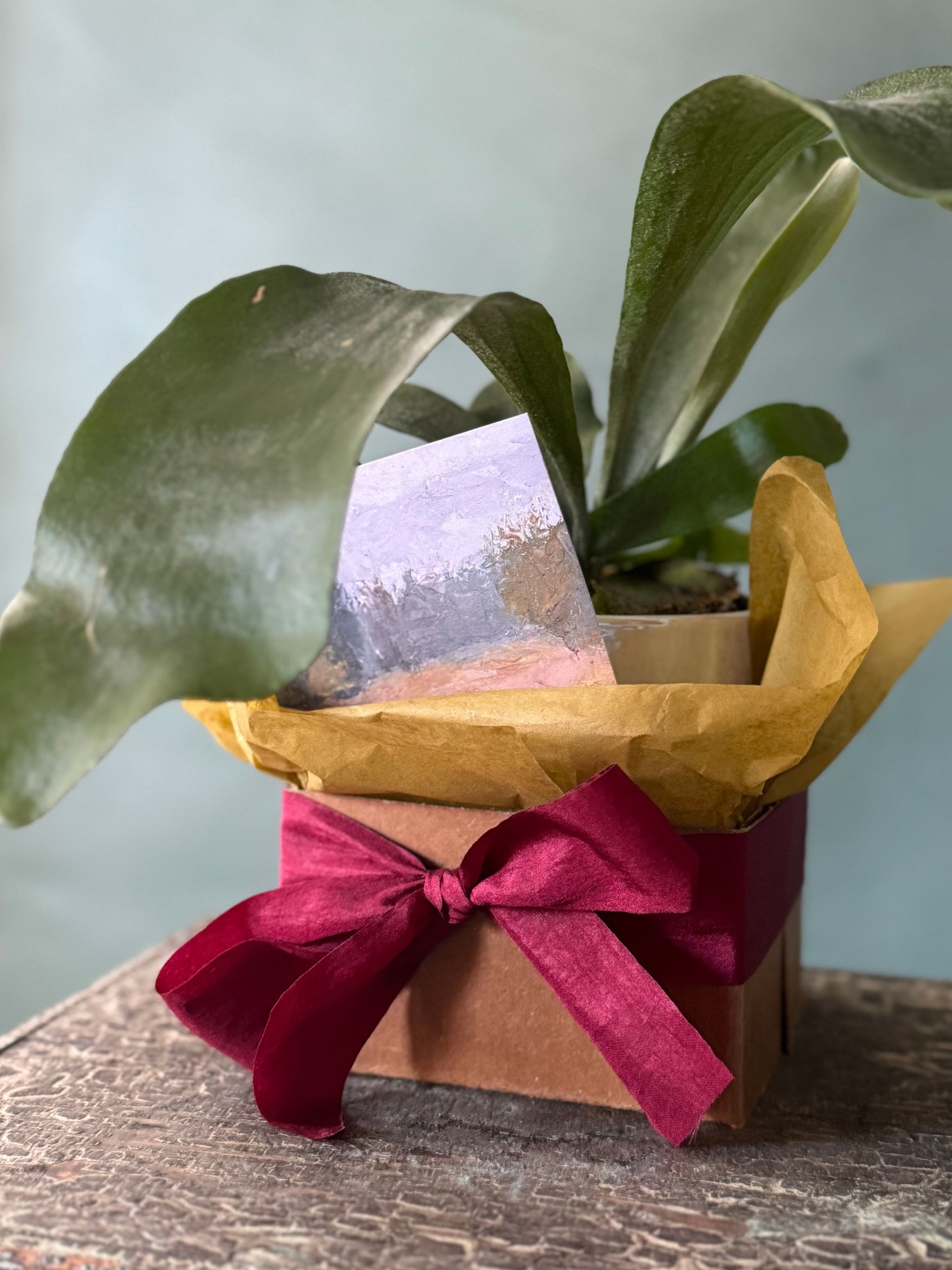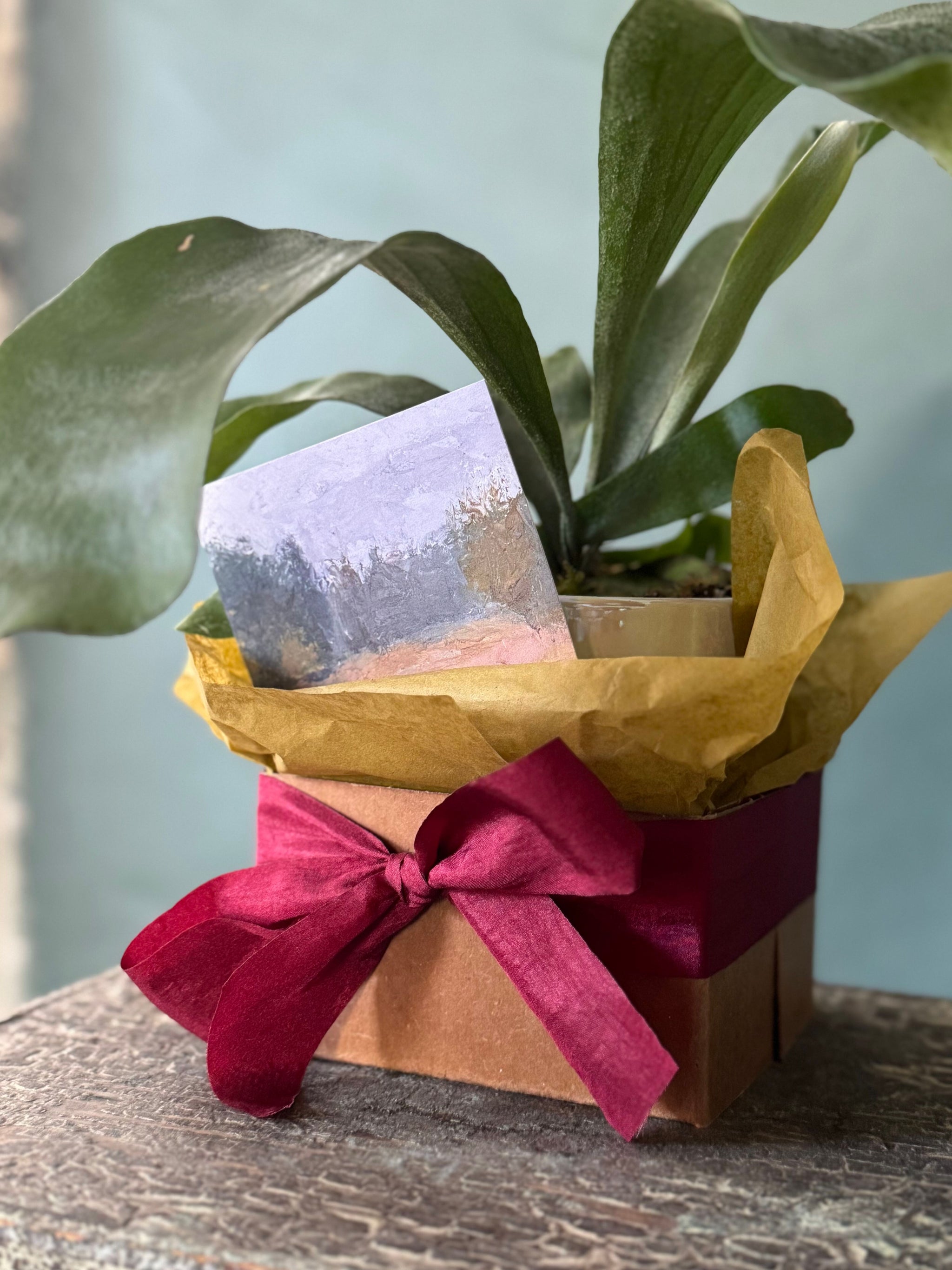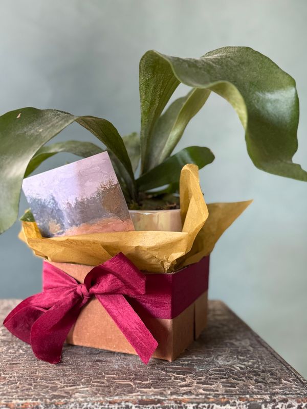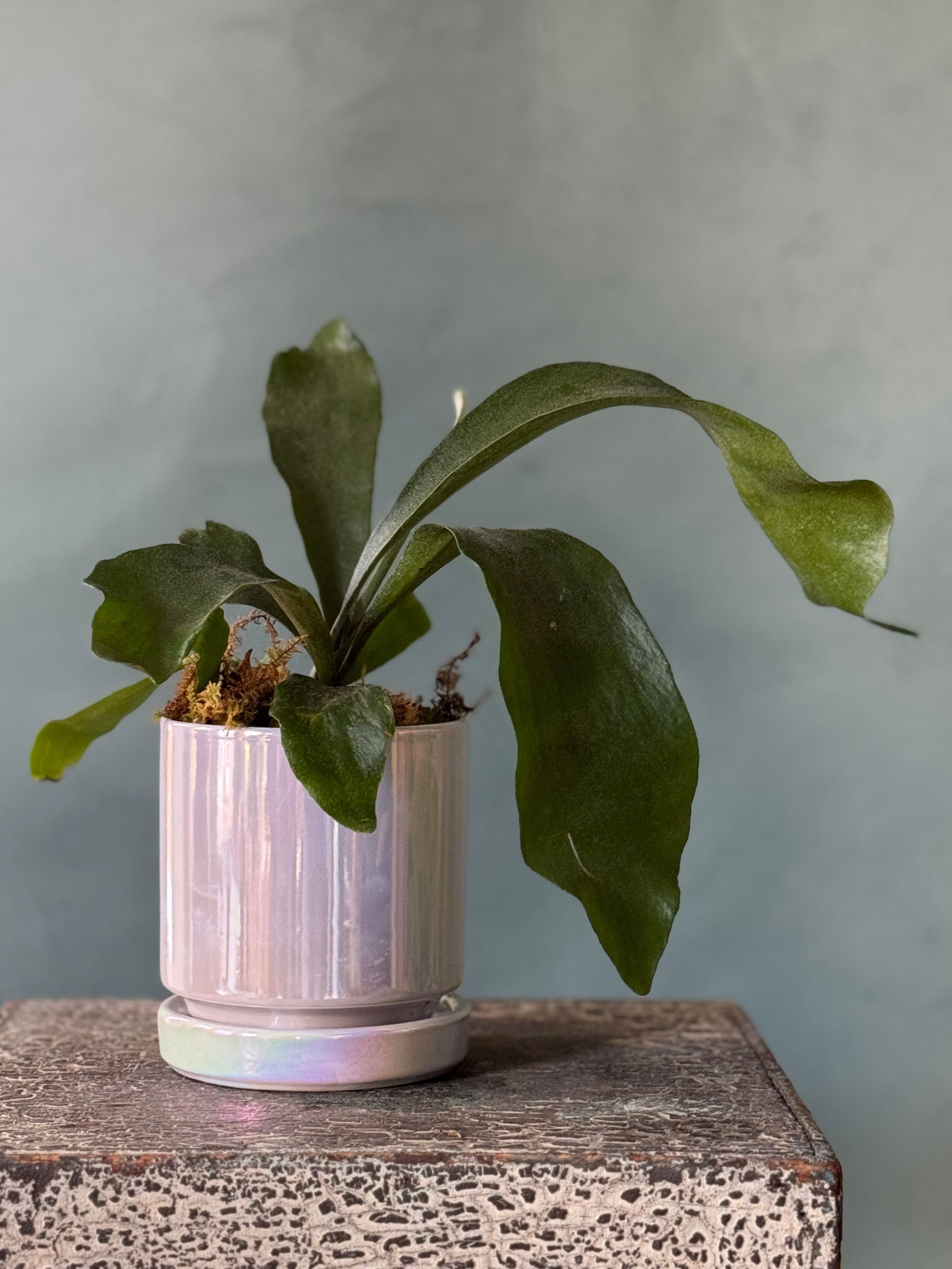A sculptural staghorn fern potted in a mother-of-pearl ceramic pot with a matching saucer. Its iridescent finish adds a soft, elegant glow, highlighting the plant’s bold, architectural fronds. A striking accent piece that elevates any shelf, table, or windowsill.