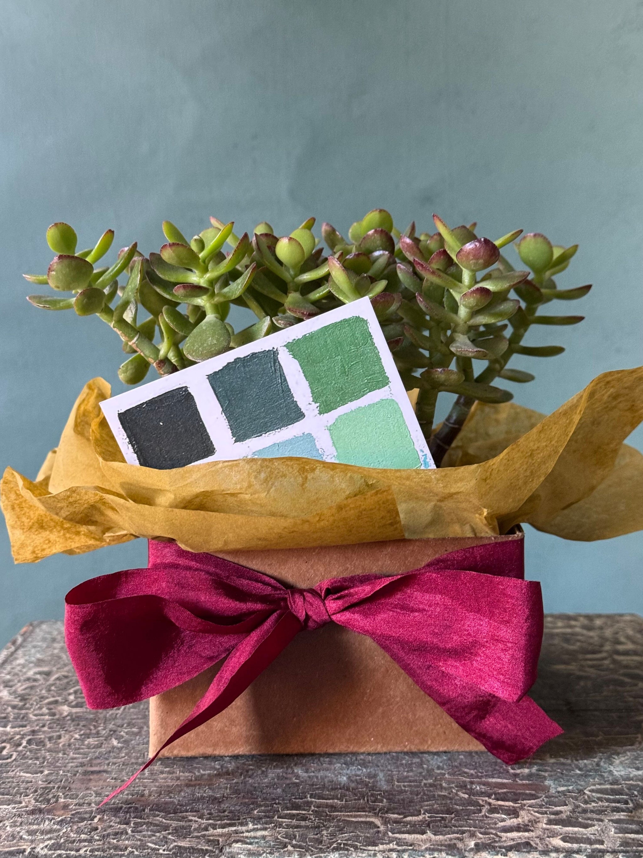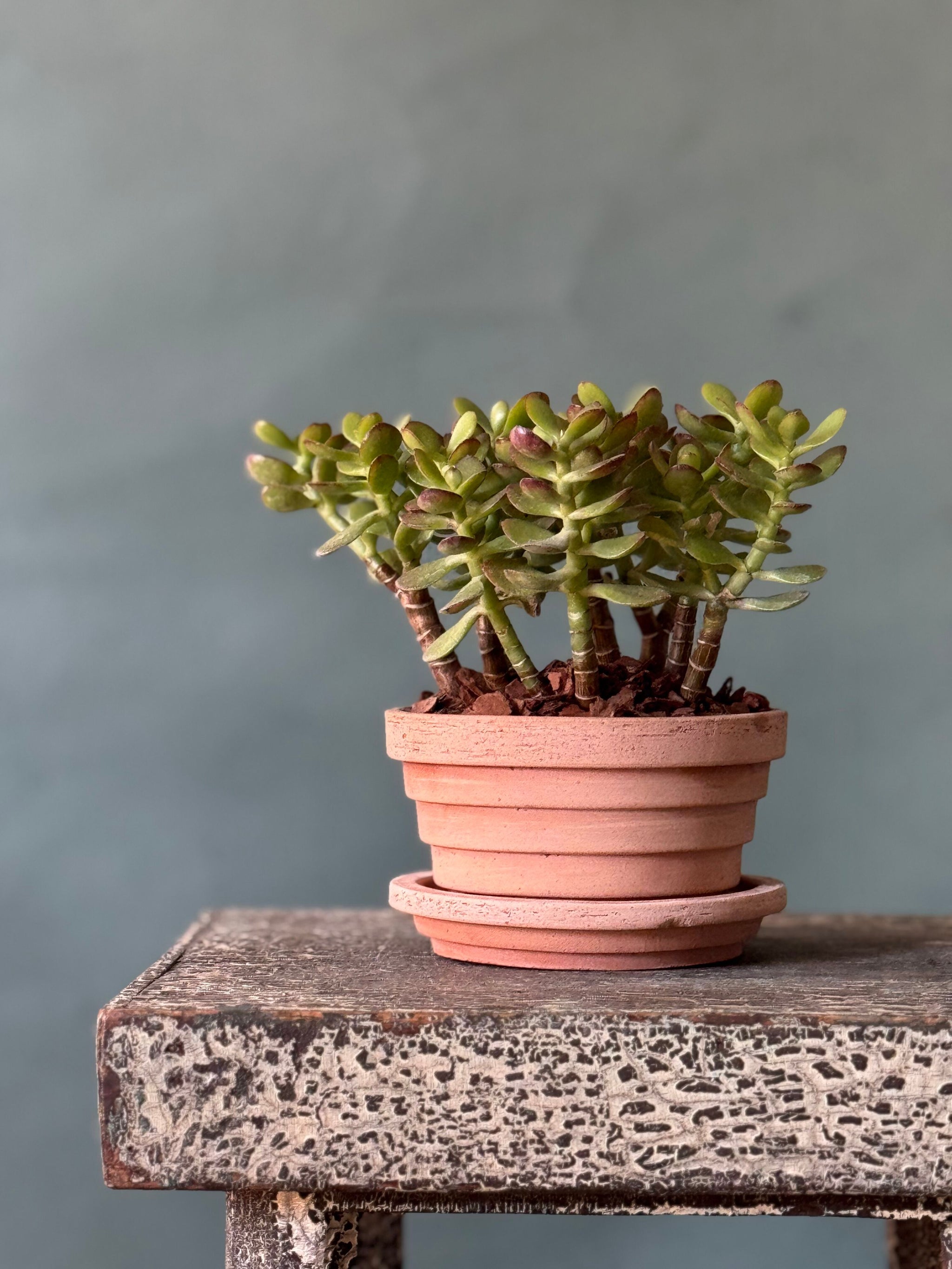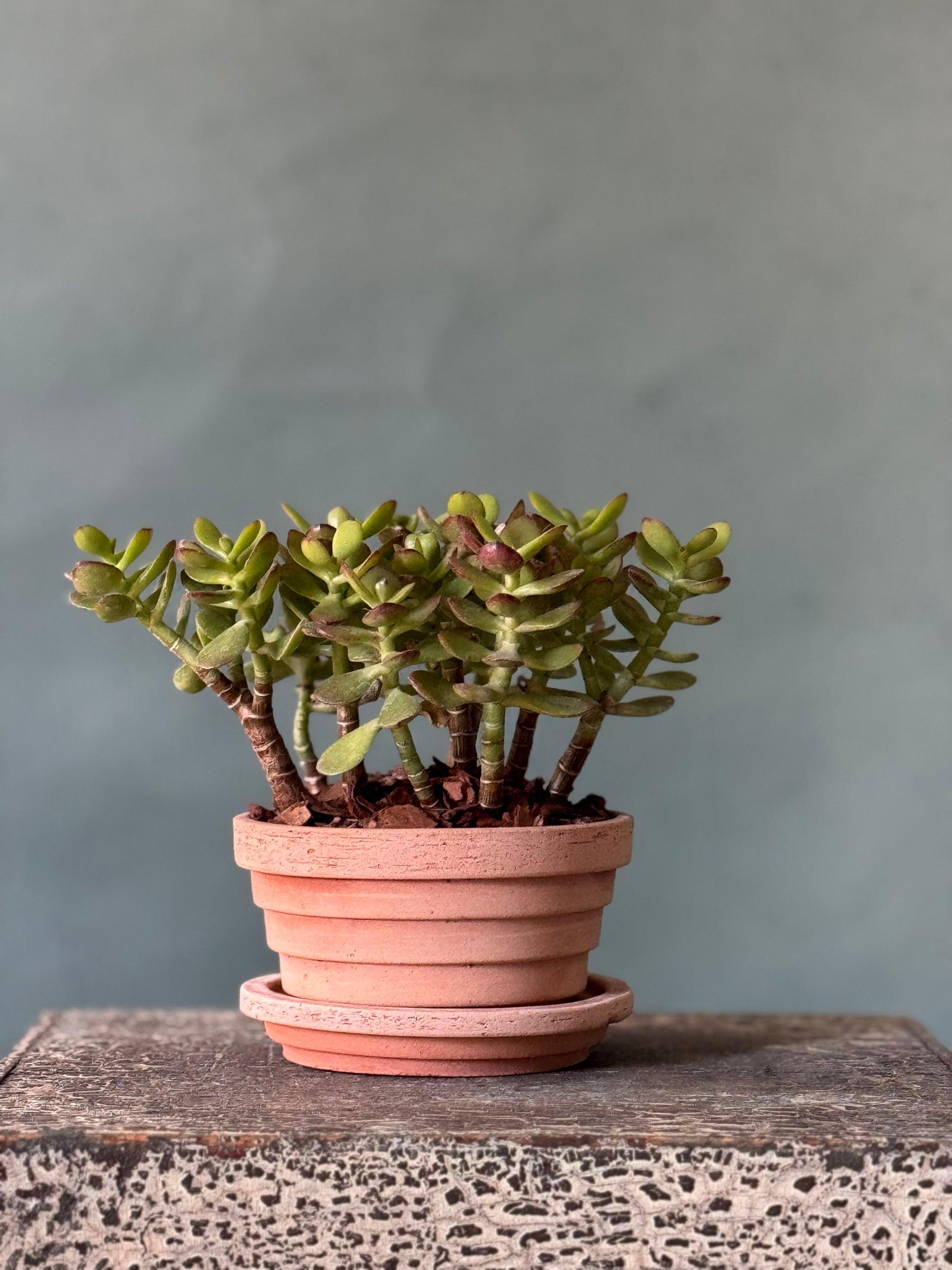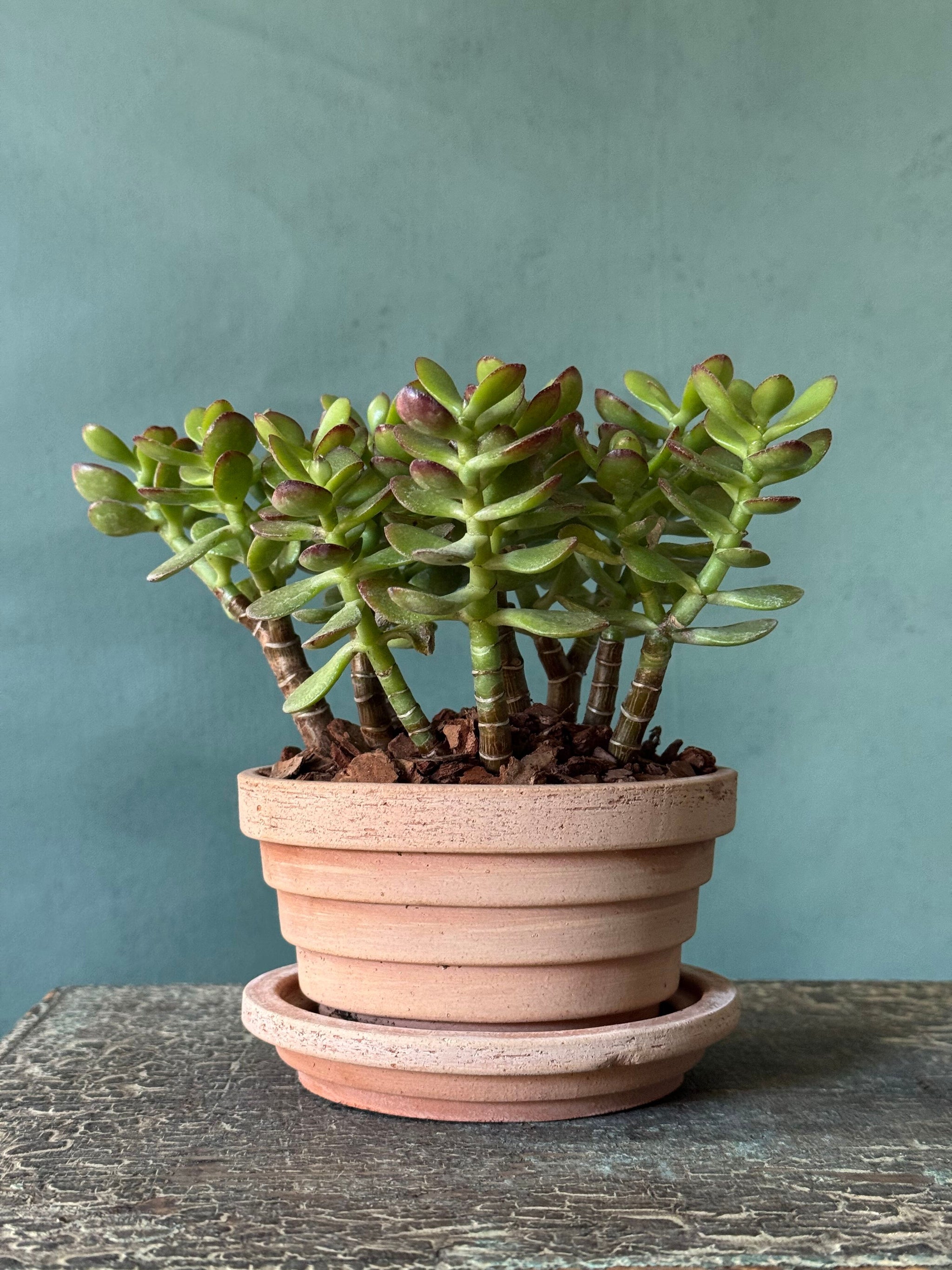 A hardy and easy-care jade plant, symbolizing growth and good fortune, potted in the Planet style from Bergs Pottery. Its sculptural, fleshy leaves are beautifully complemented by the natural earthy tones of the pot, making it a timeless accent for any tabletop, shelf, or windowsill. Perfect as a thoughtful gift or a low-maintenance addition to your home.