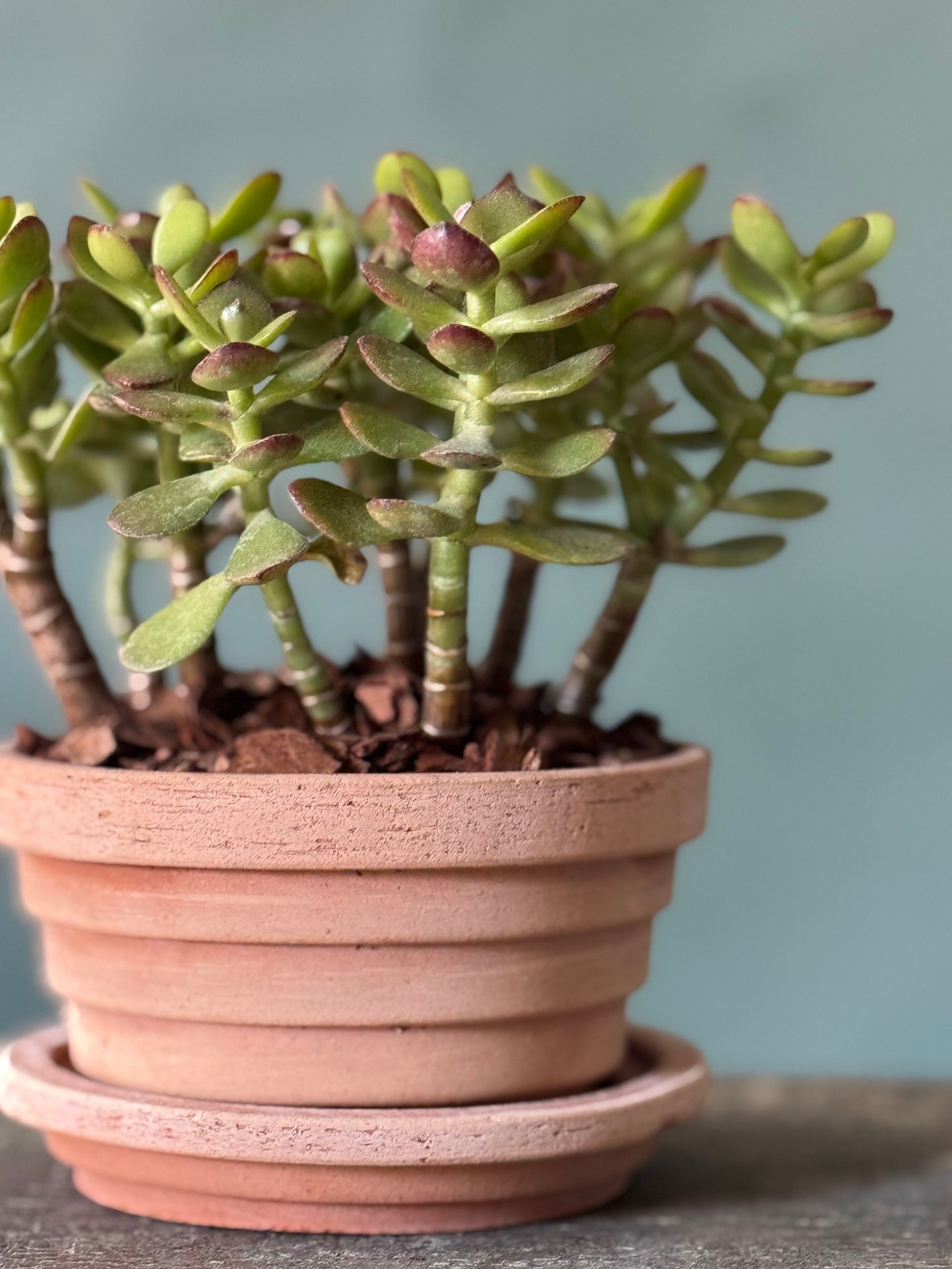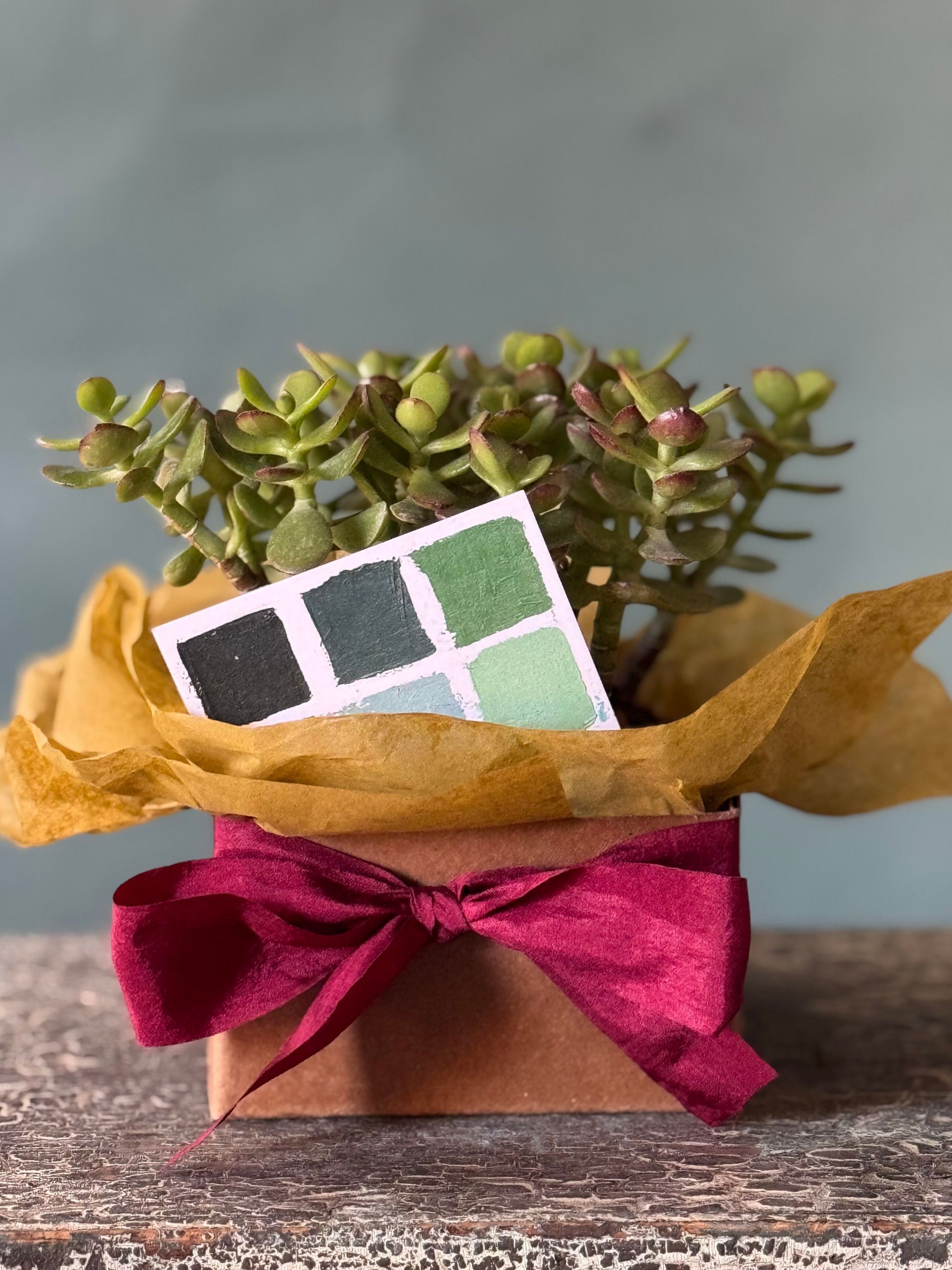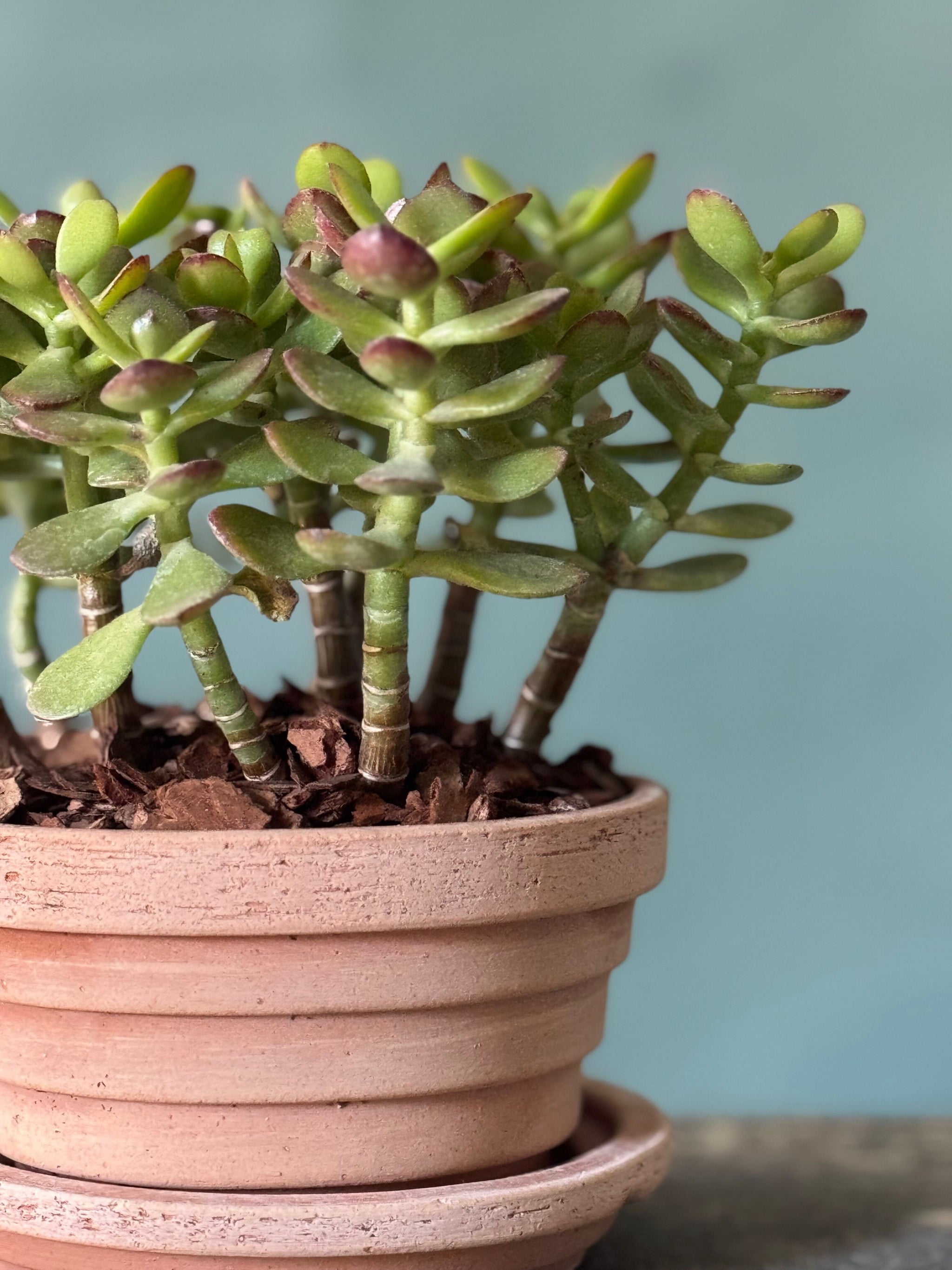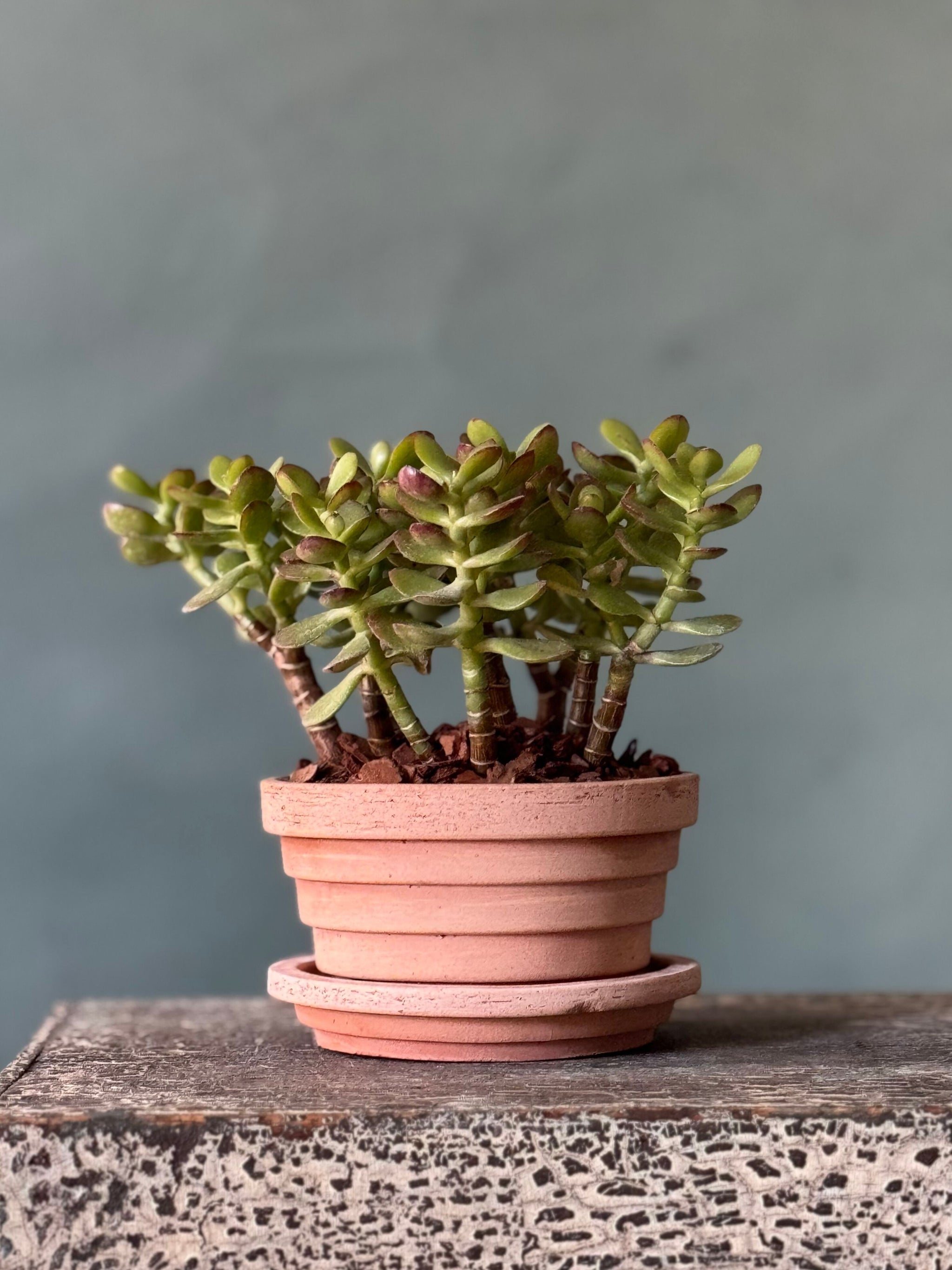 A hardy and easy-care jade plant, symbolizing growth and good fortune, potted in the Planet style from Bergs Pottery. Its sculptural, fleshy leaves are beautifully complemented by the natural earthy tones of the pot, making it a timeless accent for any tabletop, shelf, or windowsill. Perfect as a thoughtful gift or a low-maintenance addition to your home.