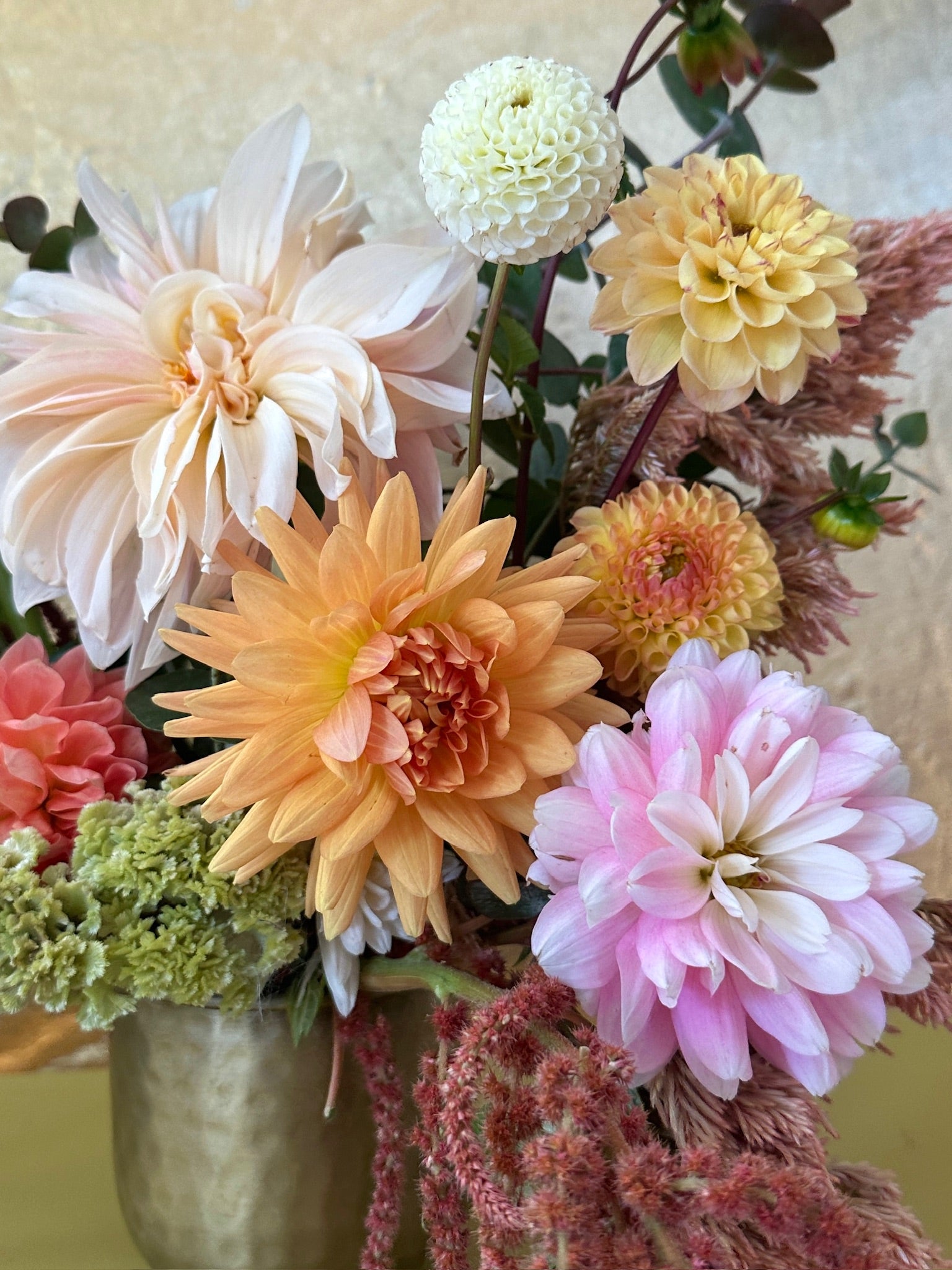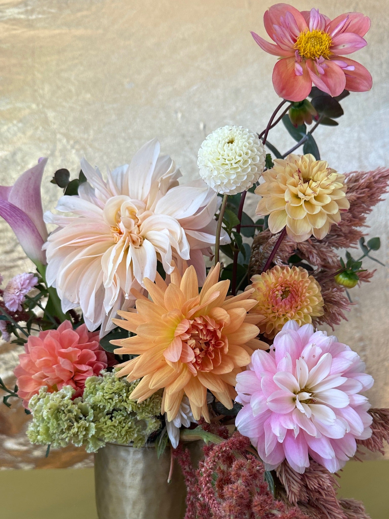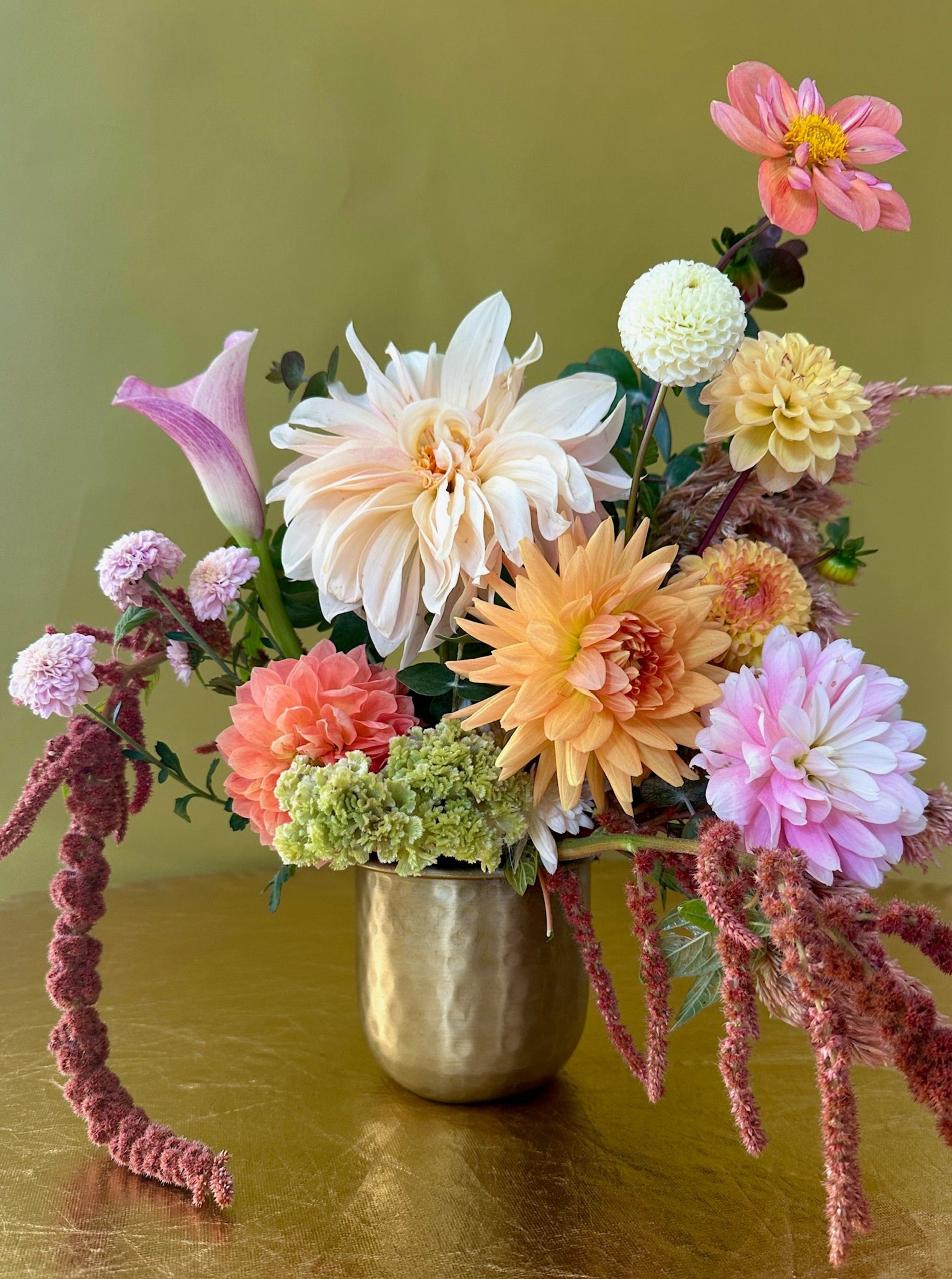 Set the table with a bountiful floral curation in a hammered brass vase !