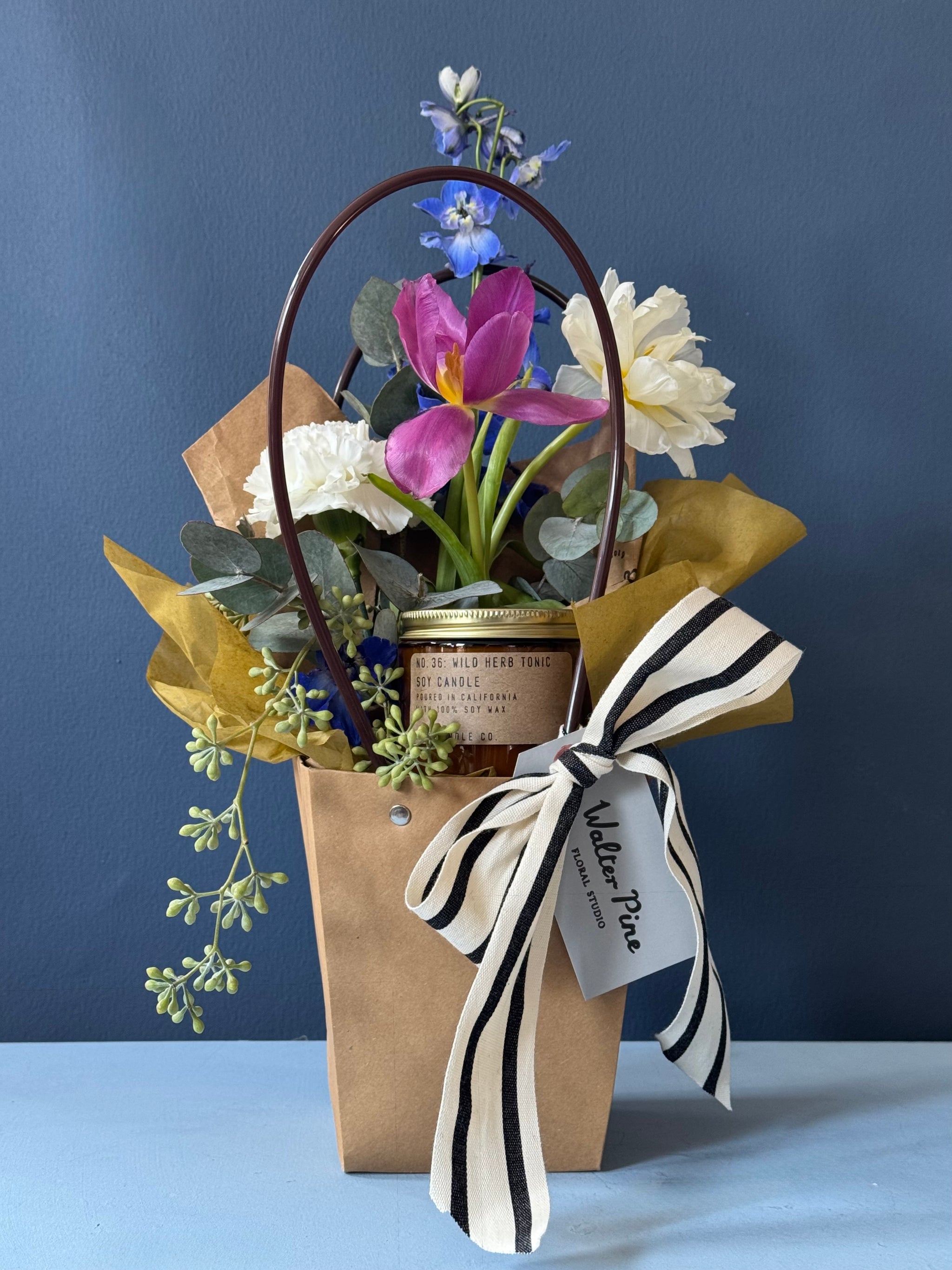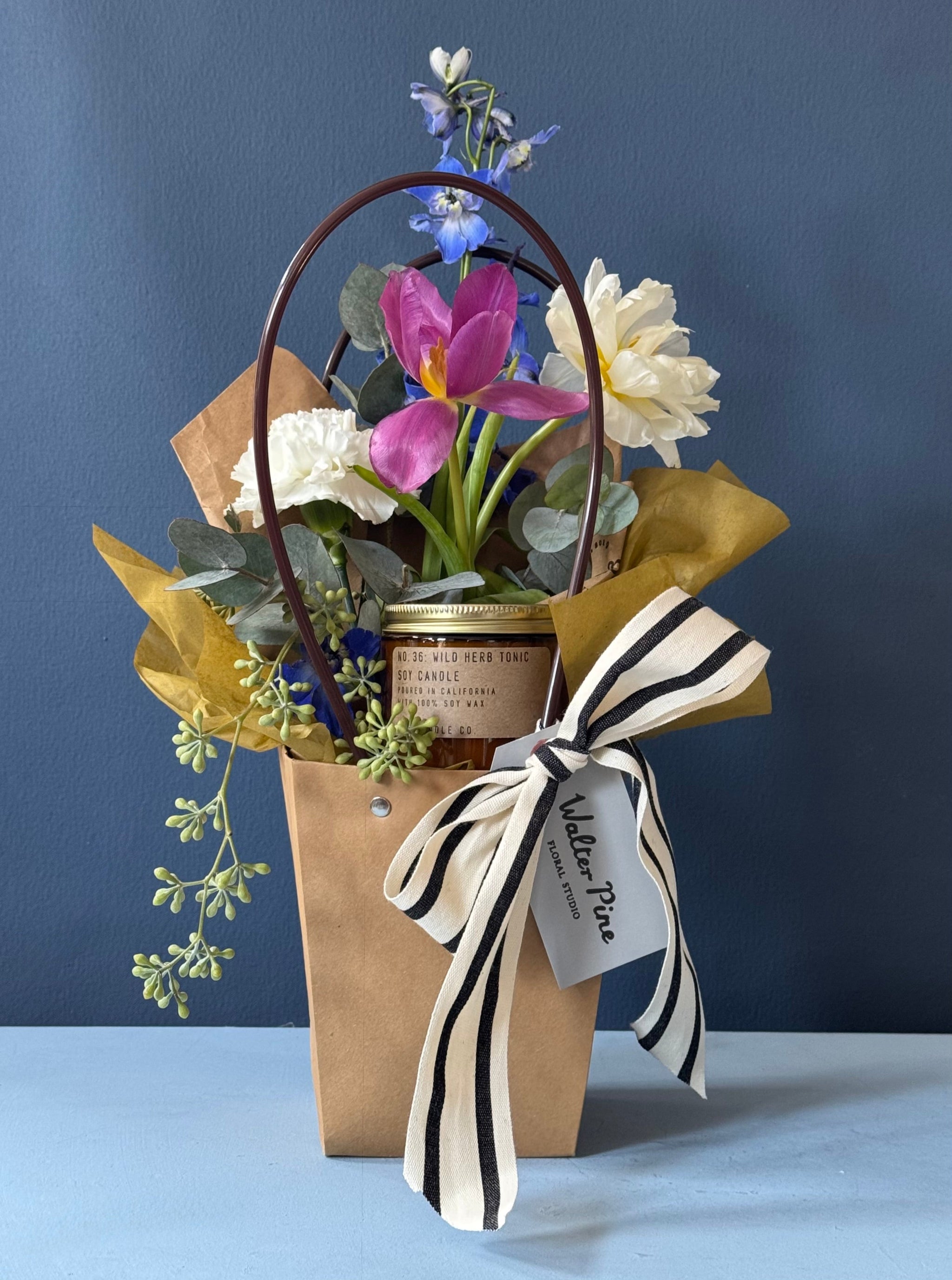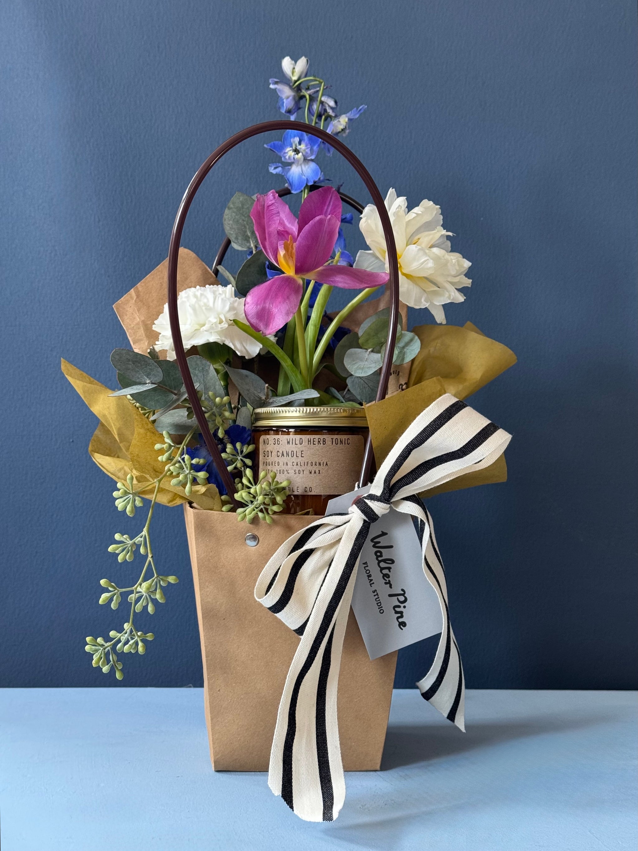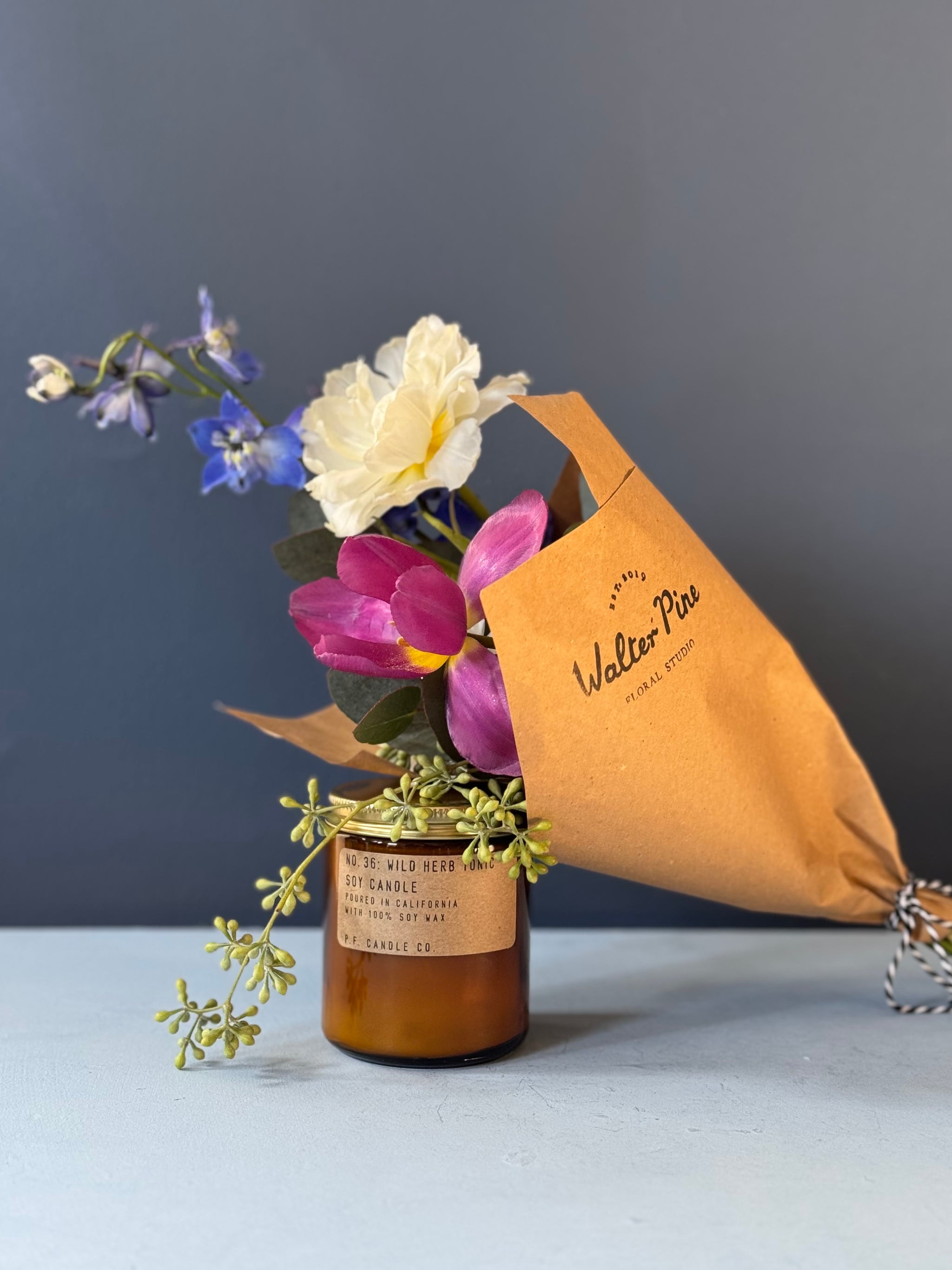 A timeless pairing, flowers + candle! Featuring our favorite new scent from P.F. Candle Co (Wild Herb Tonic) and a classic Walter Pine Picnic Bouquet.