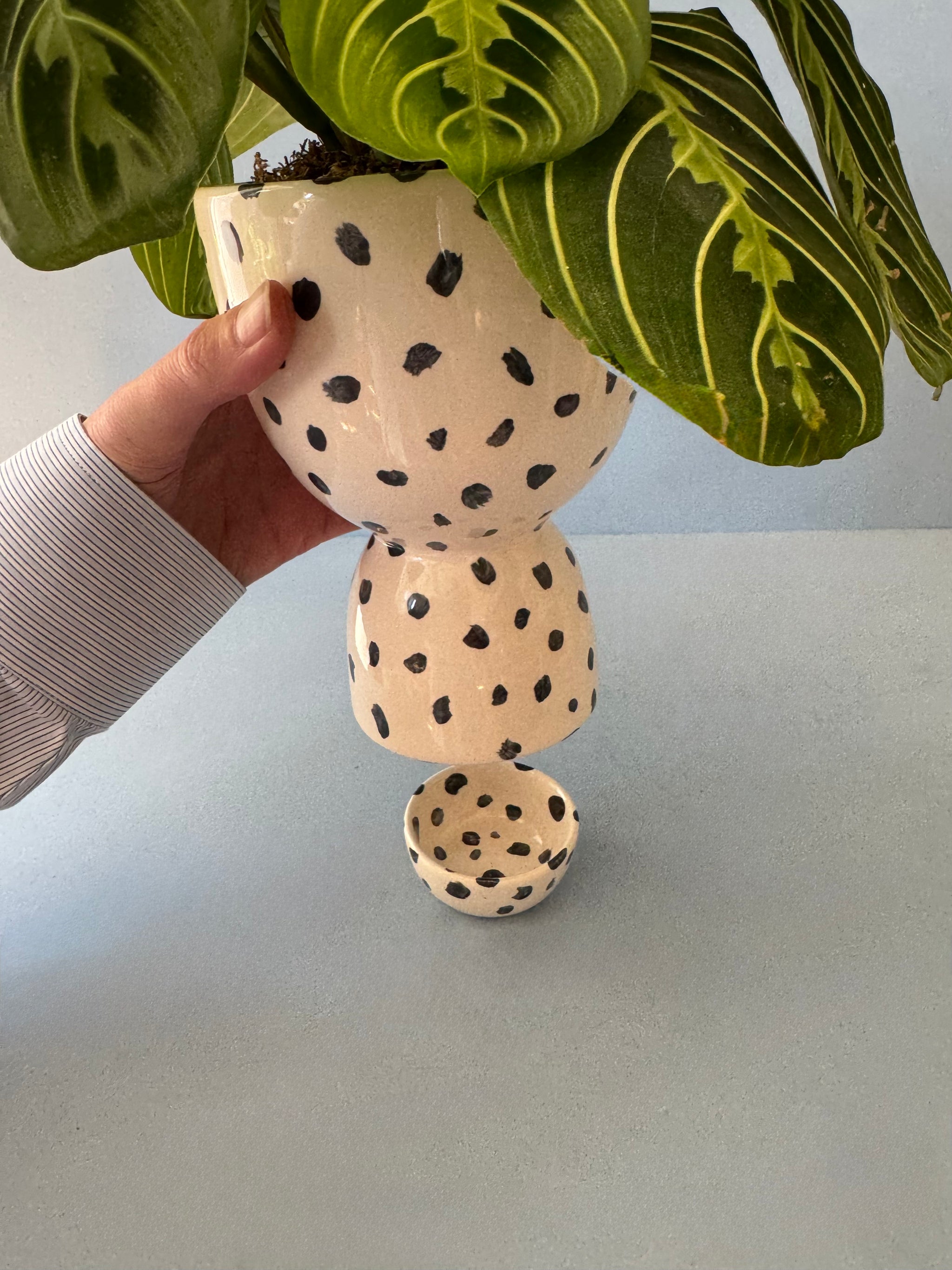 This plant comes potted in a black & white dotted pedastal pot with mini saucer.