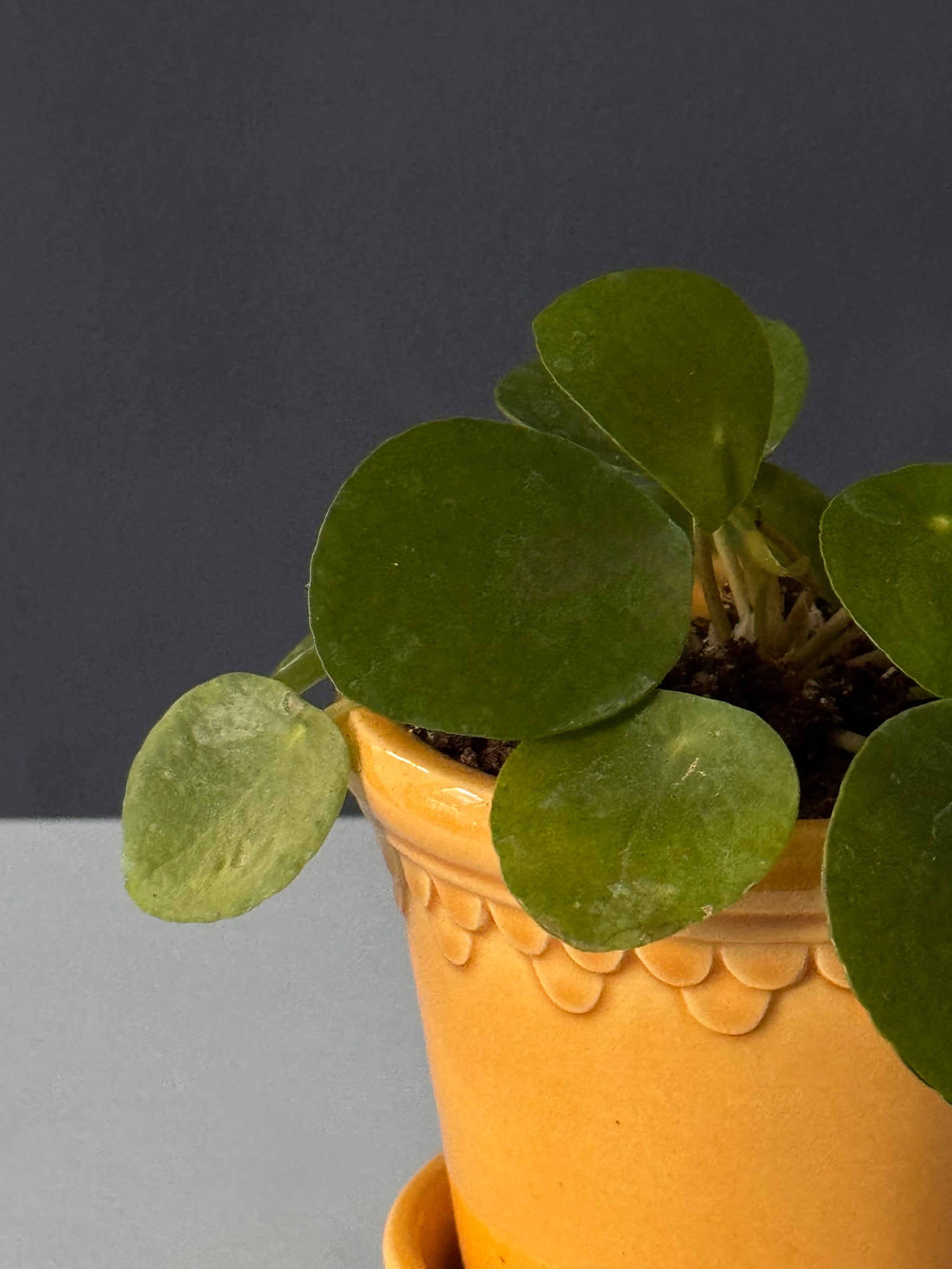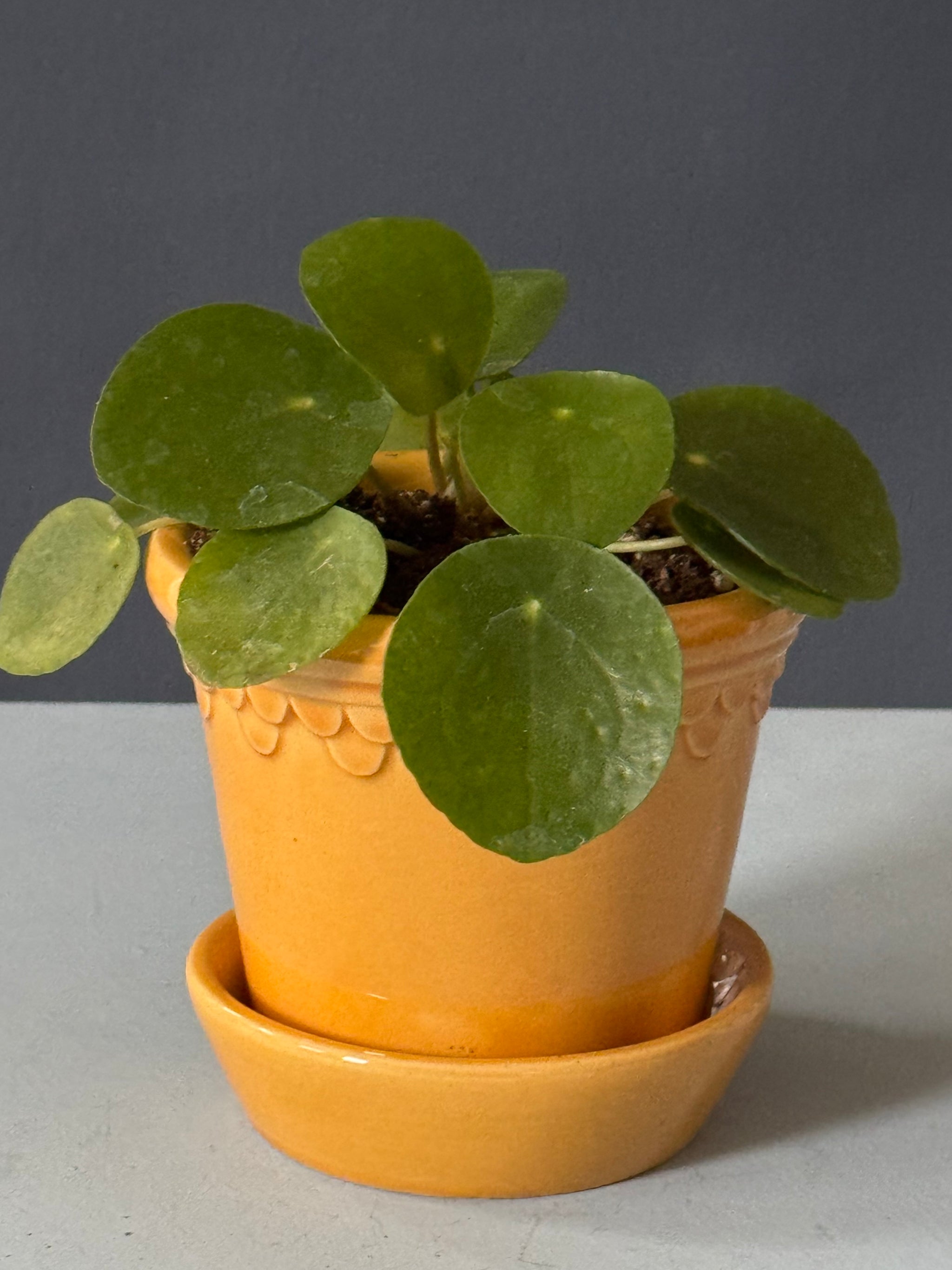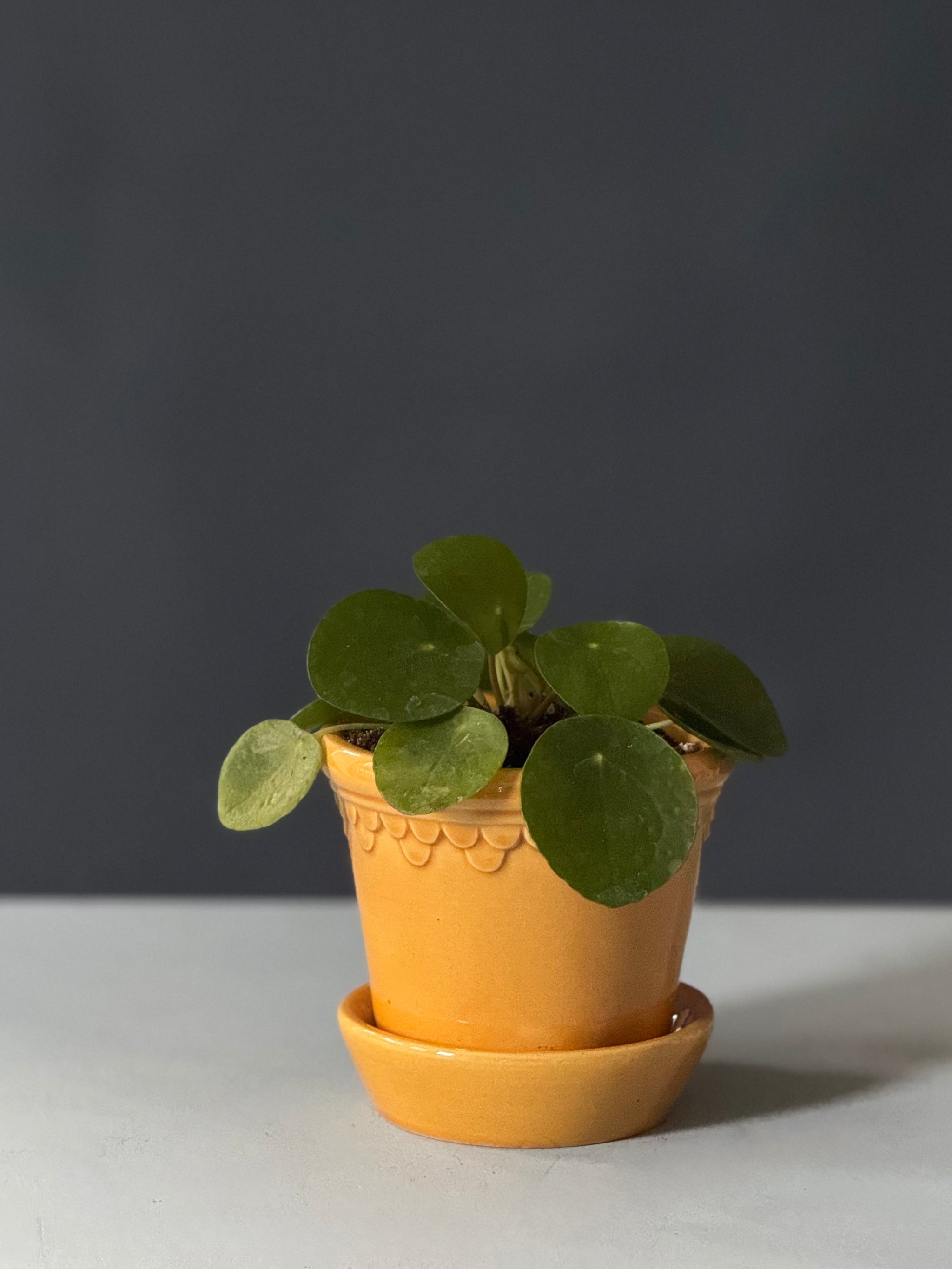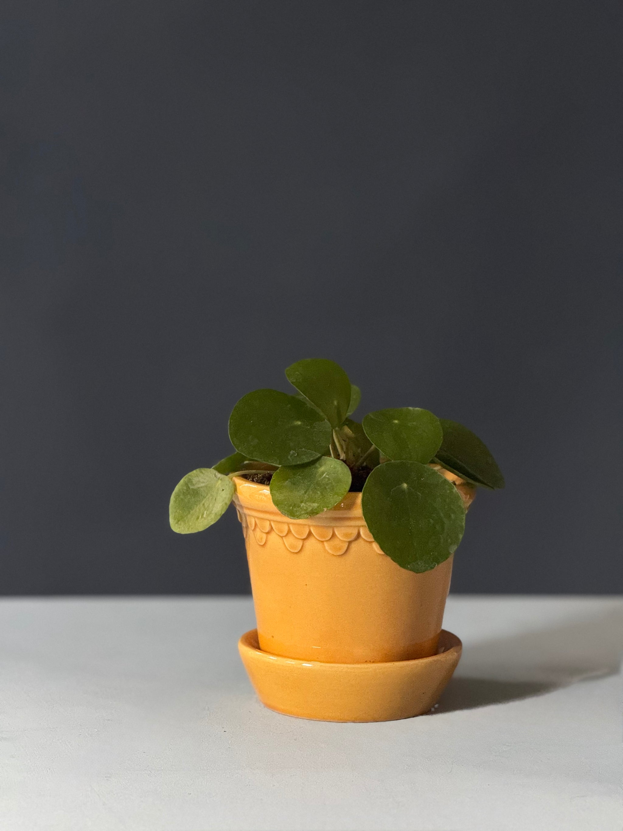 This plant comes potted in a Bergs mustard yellow glazed pot with matching saucer.