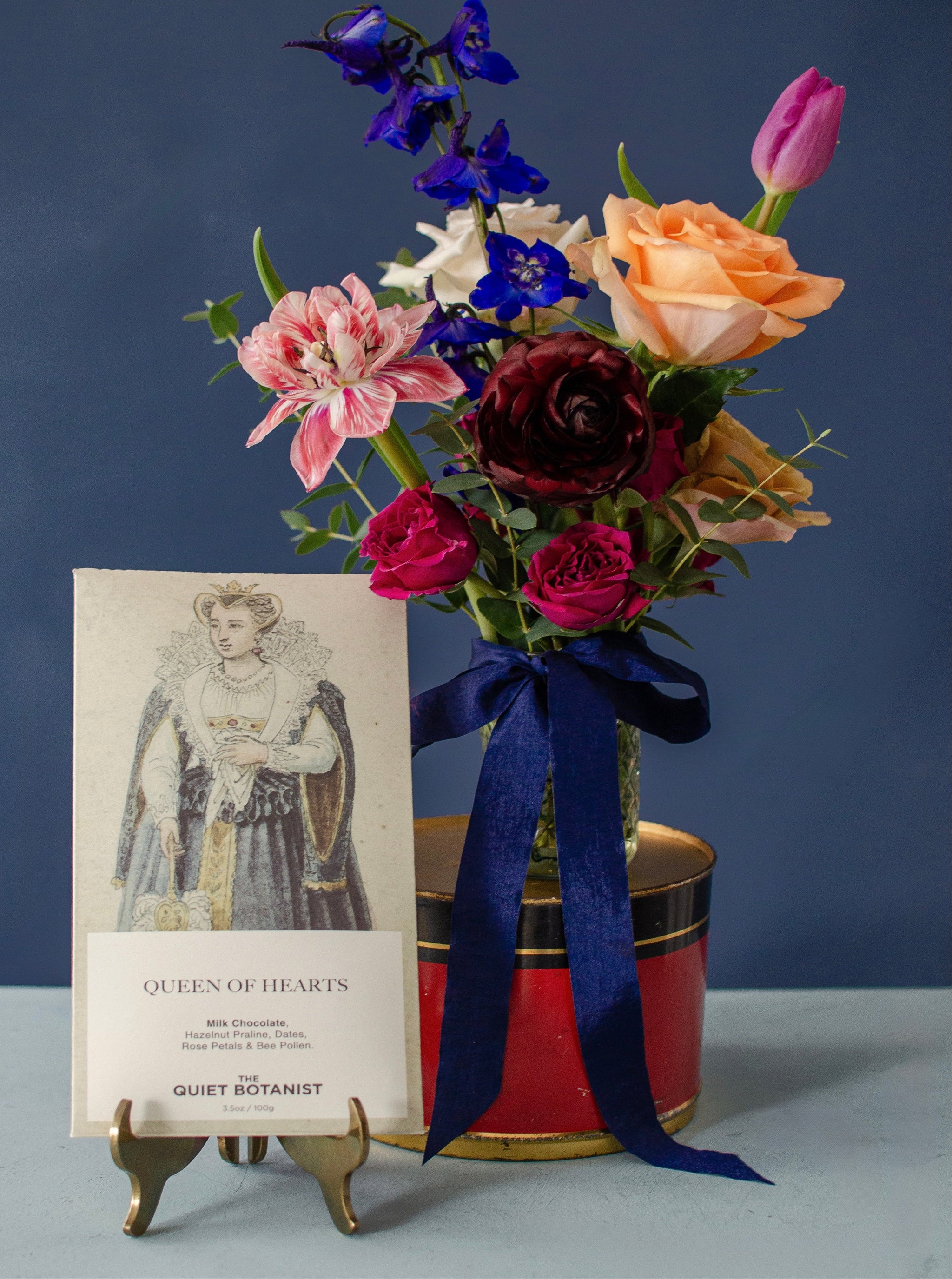 (1) Quiet Botanist Queen of Hearts Chocolate Bar: A decadent milk chocolate bar infused with creamy hazelnut praline, soft organic dates, and a delicate touch of golden bee pollen and rose petals.