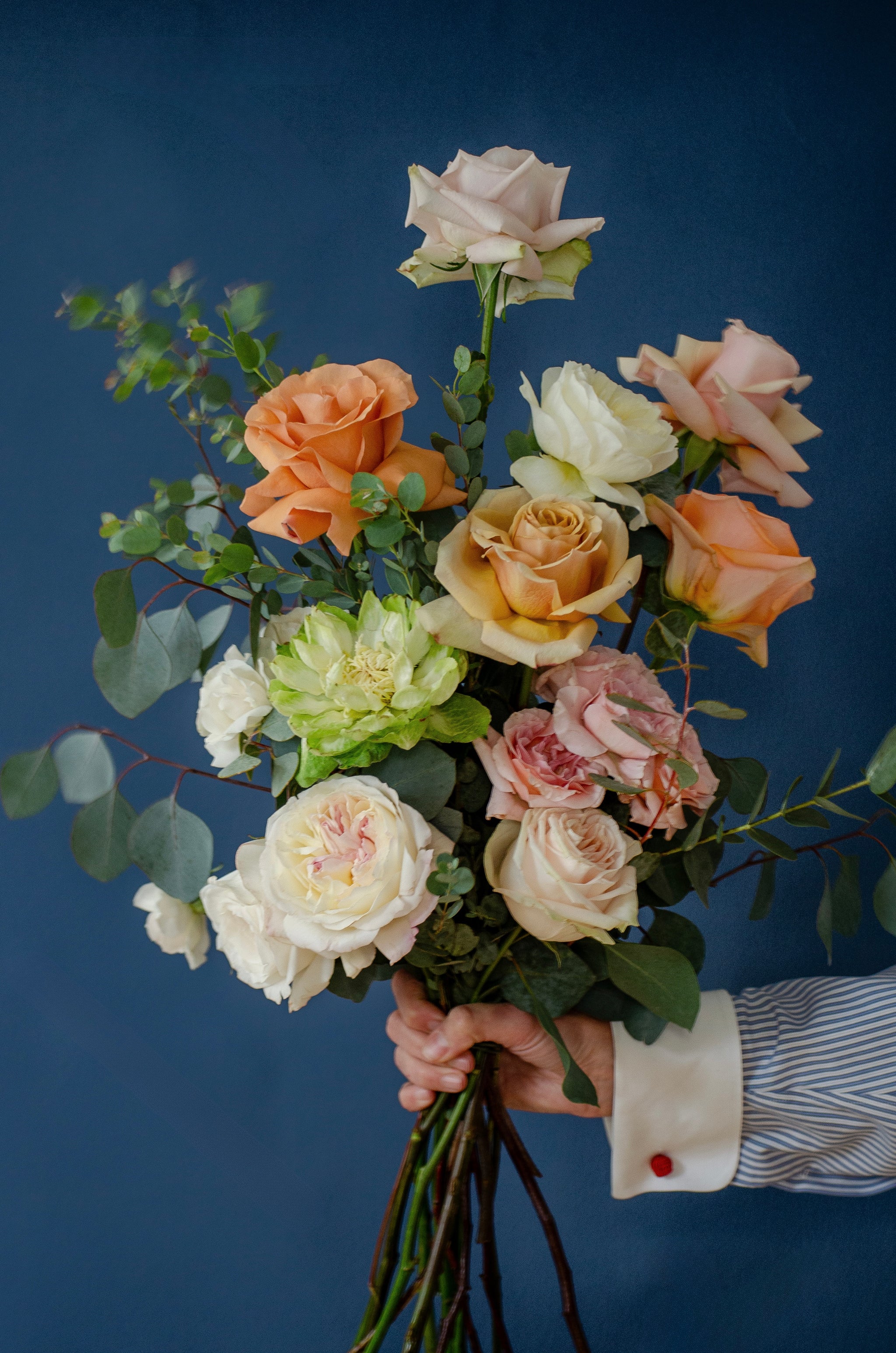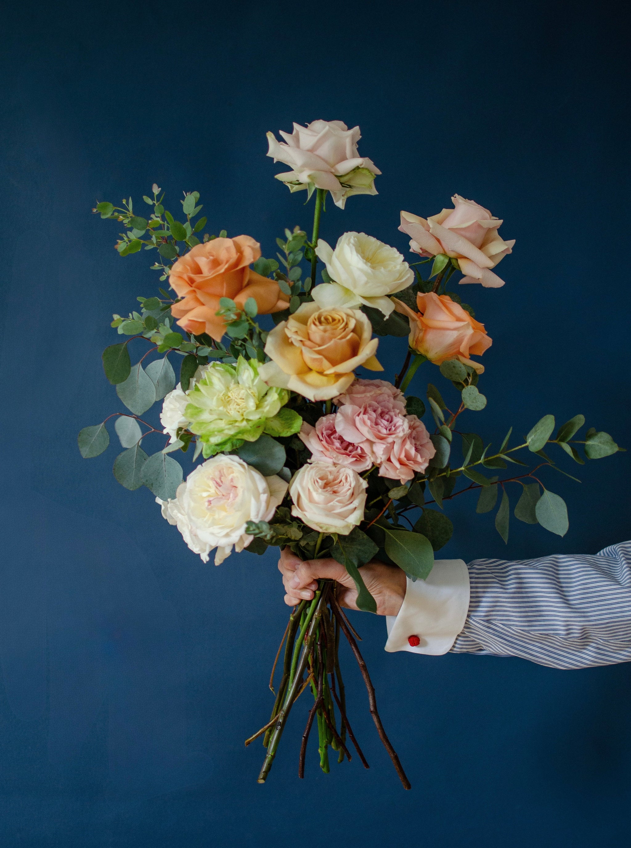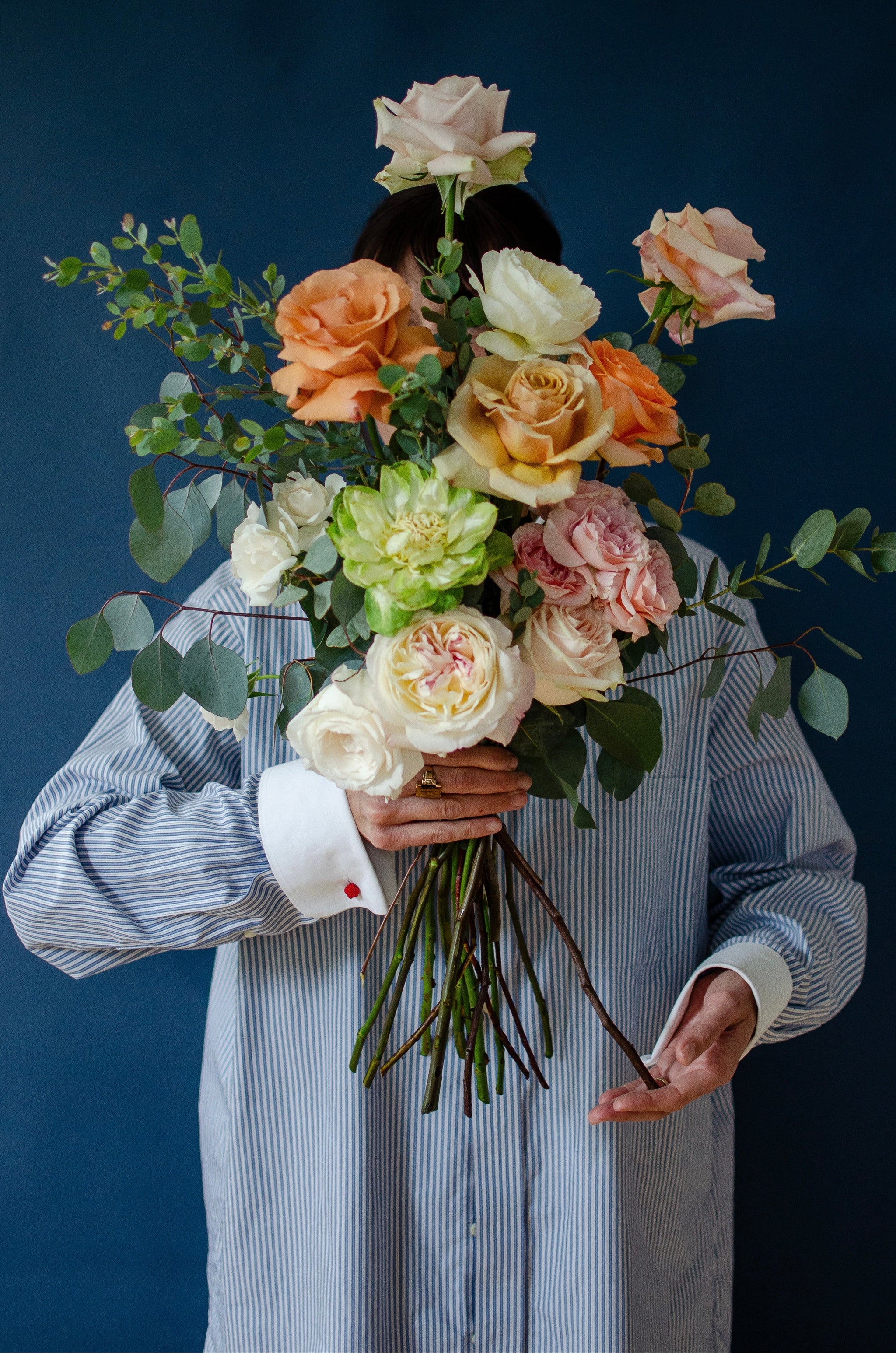 This bouquet of regal roses, the Queen of Flowers, is a thoughtful curation of our favorite garden roses in an elegant color palette. Each bouquet is mixed with eucalyptus for added texture and stylishly wrapped to celebrate your love.
