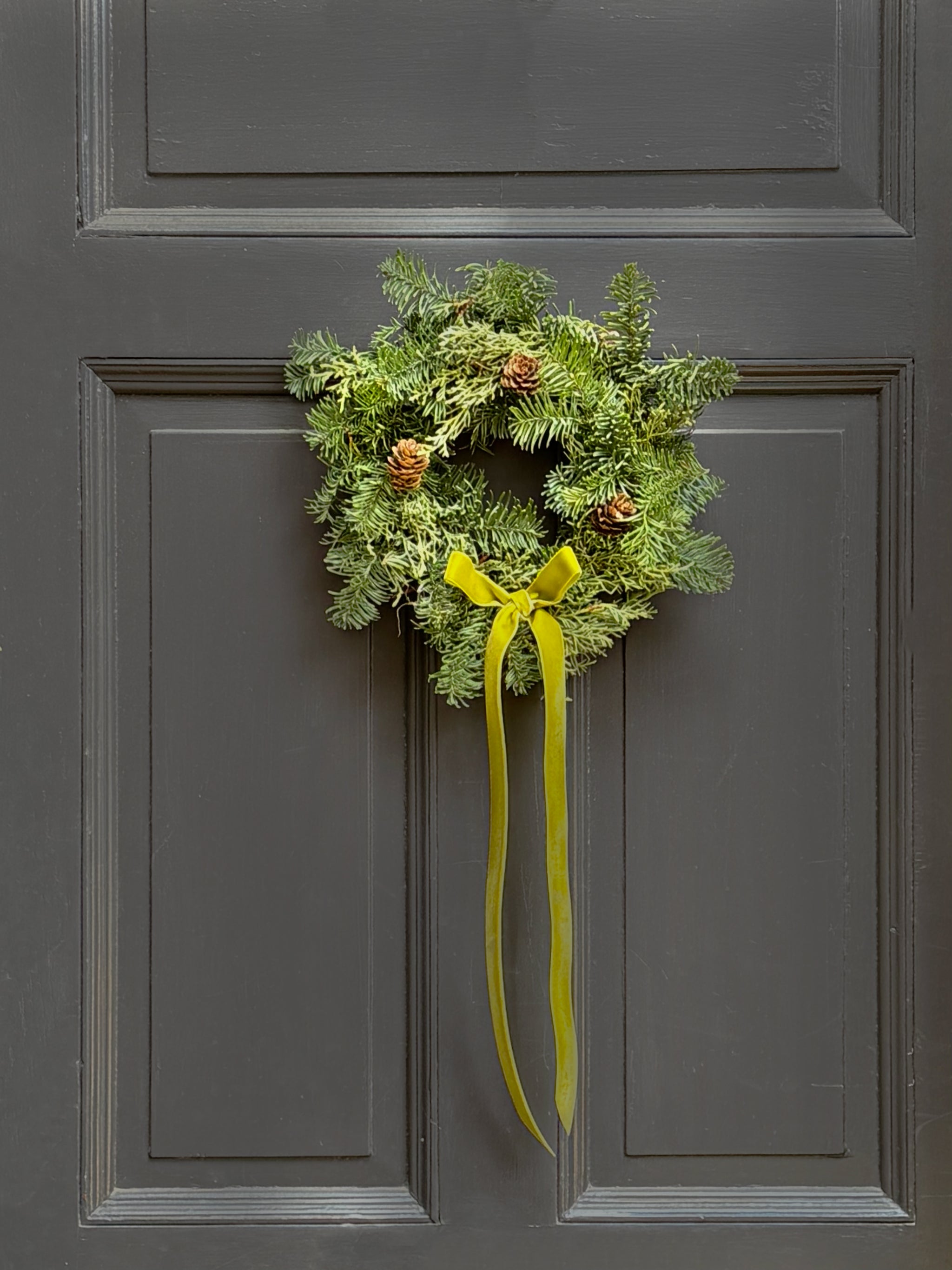 Our handcrafted Pinecone Picnic Wreath is beautifully textured, featuring our favorite winter greens, three mini festive pinecones, and a sweet green velvet ribbon. This look is timeless and joyful—a perfect addition throughout the holiday season!