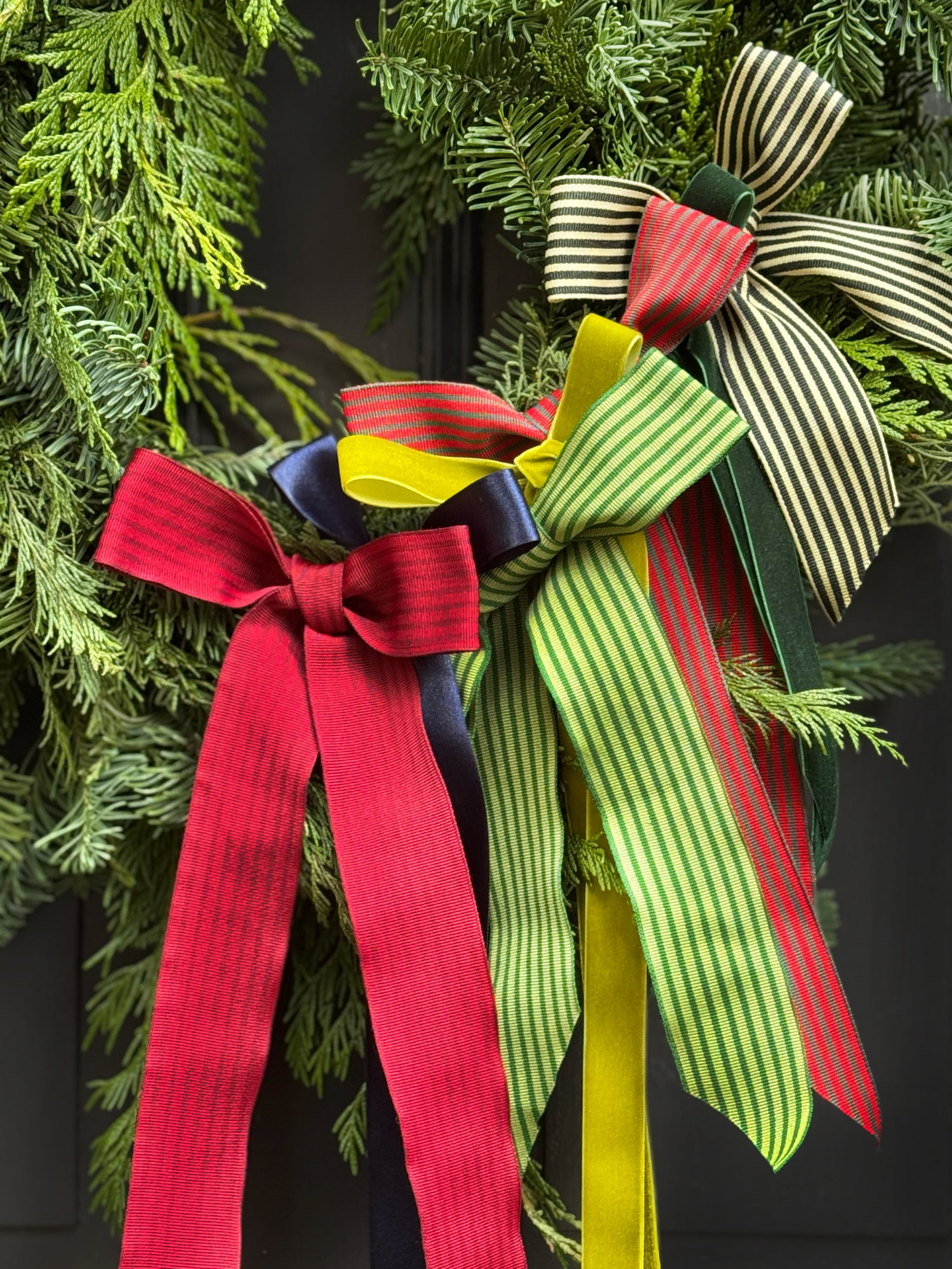 Our stylish Beau Wreath offers a classic look with a festive pop, combining our favorite Cedar and Noble Fir branches with a stacked string of ribbon bows, inspired by men's shirting. This statement piece is handsome, playful, and sure to bring cheer into every setting.