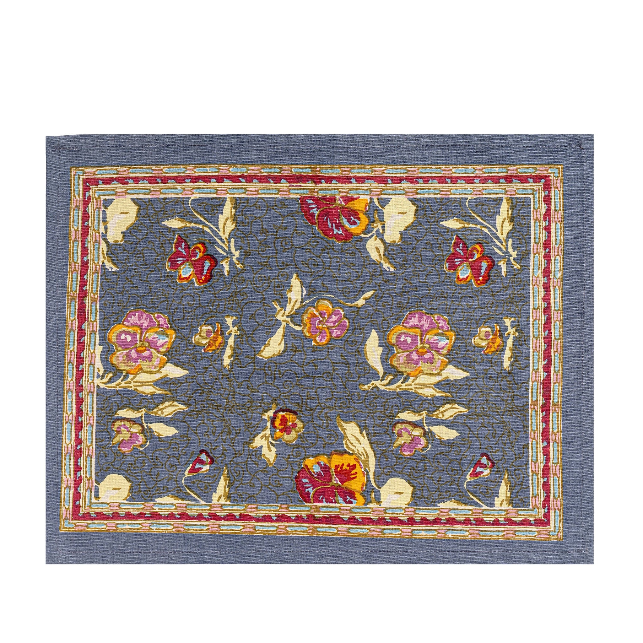The Pansy placemat features a harmonious blend of floral and abstract motifs, offering a timeless yet contemporary foundation for your table. This French linen showcases a vibrant palette and intricate patterns, handprinted by skilled artisans using traditional methods to create a truly unique work of art.